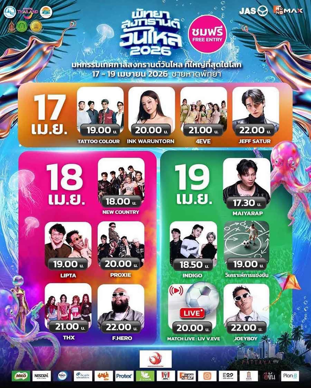期間中は、海岸沿いでの水かけイベントをはじめ、仏像への献水や砂の仏塔づくり、伝統舞踊などの文化体験が行われます。また、INK Waruntorn、Jeff Satur、4EVE、F.HERO、Joey Boy、Lipta、PROXIEなど、タイを代表する人気アーティストによるコンサートも予定されています。
