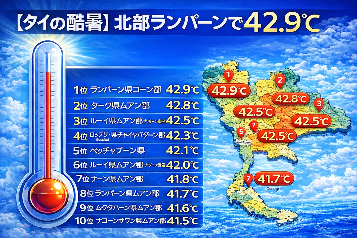 この日の最高気温は、ランパーン県コーン郡で42.9℃を記録。前日をさらに上回る数値となり、暑さのピークが続いている状況です。続いてターク県ムアン郡で42.8℃、ルーイ県ムアン郡ナポーン地区で42.5℃と、広い範囲で極めて厳しい暑さとなりました。