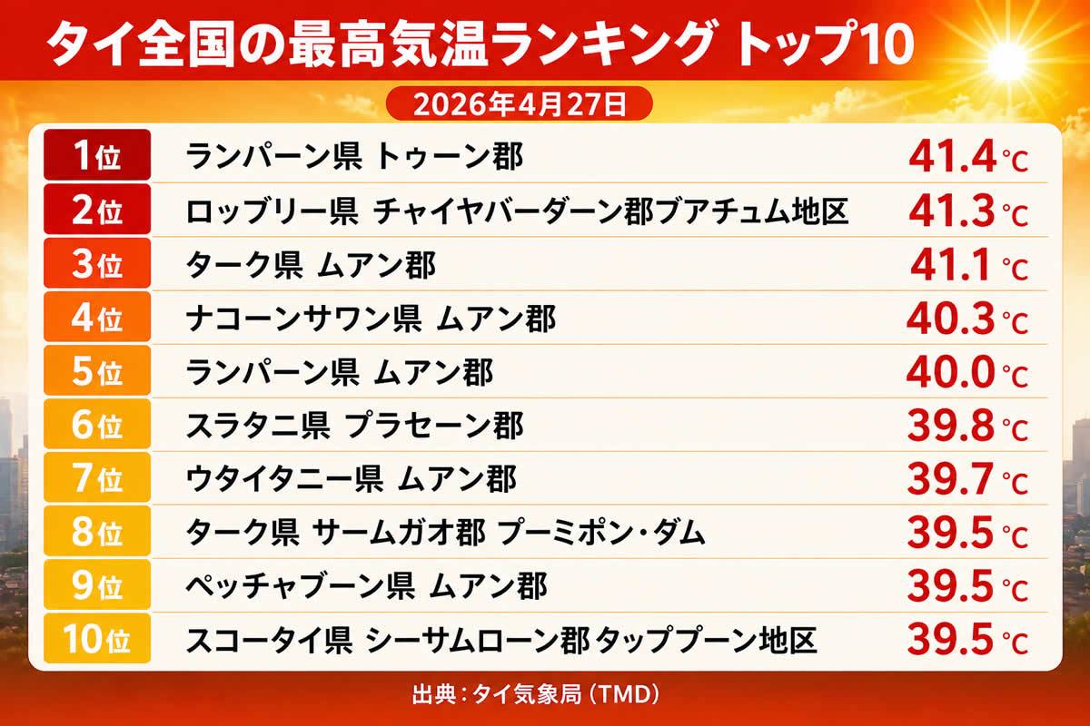タイ気象局(TMD)は2026年4月27日、全国の最高気温ランキングを発表し、北部ランパーン県トゥーン郡で41.4度を観測したと明らかにしました。各地で40度を超える猛暑となっており、厳しい暑さへの警戒が呼びかけられています。
