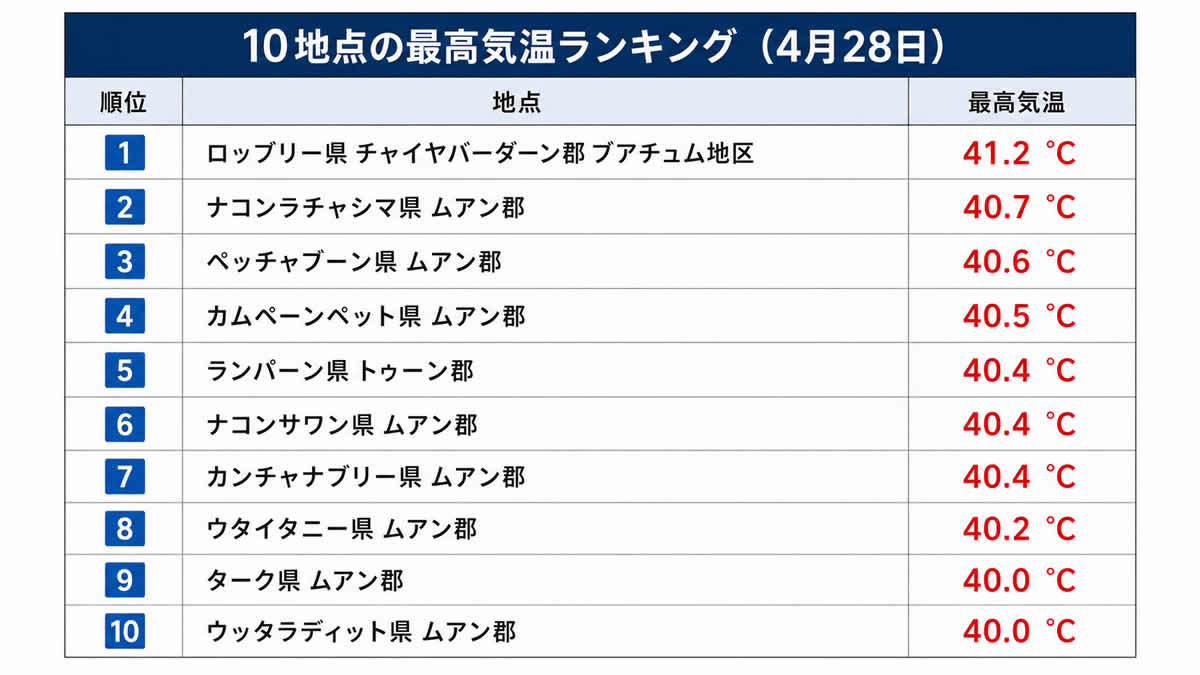タイ気象局が発表した2026年4月28日の全国最高気温ランキングで、最も暑かったのはロッブリー県チャイヤバーダーン郡ブアチュム地区の41.2℃でした。各地で40℃を超える厳しい暑さとなり、真夏の猛暑が続いています。
