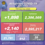 タイ保健省は2022年8月13日(土)、1日で確認された新型コロナウイルス陽性者が2,140人(海外[...]