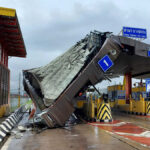 タイ中部チャチュンサオ県で2022年8月1日午前10時34分、大雨と強風の中、高速道路の料金所ゲート[...]