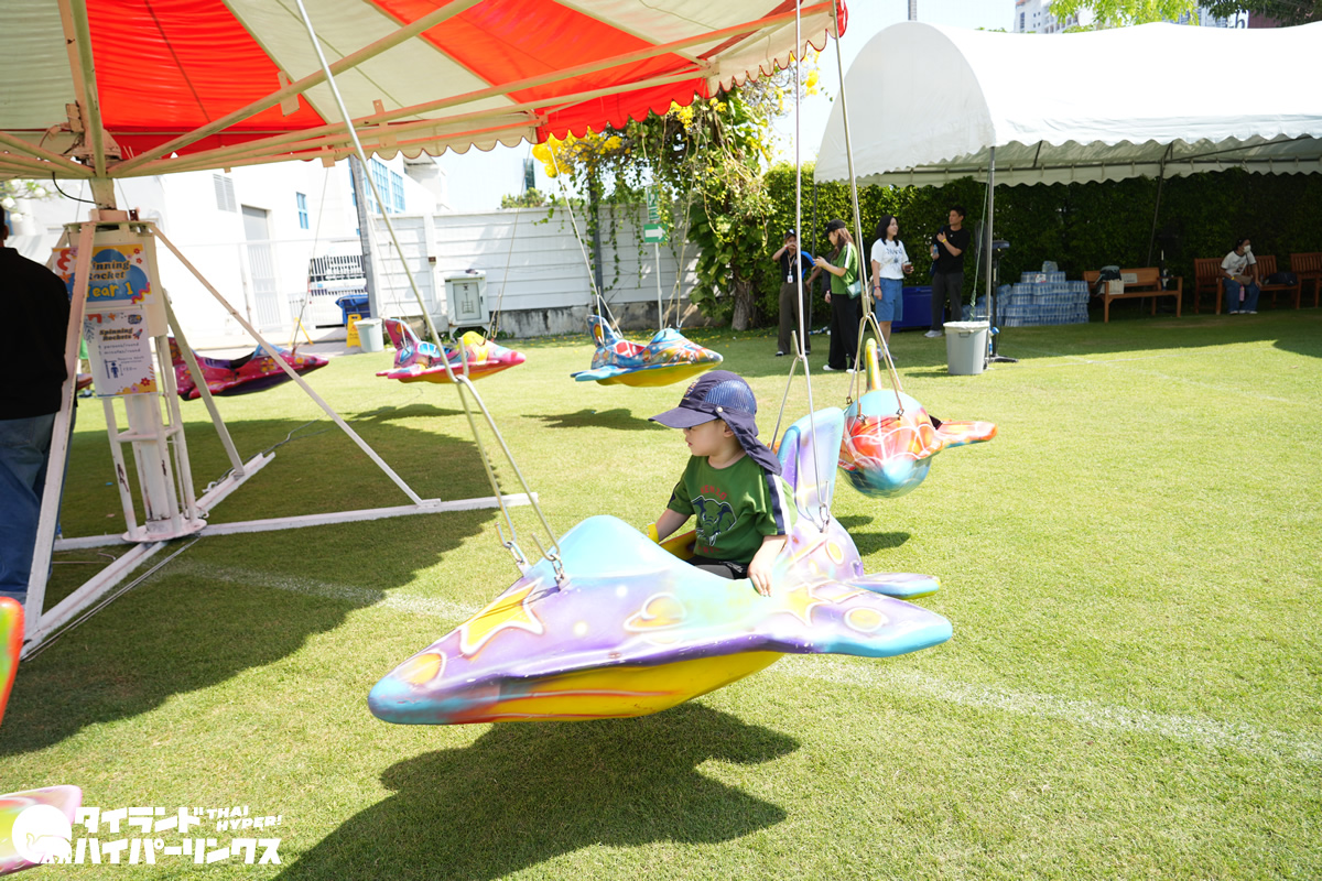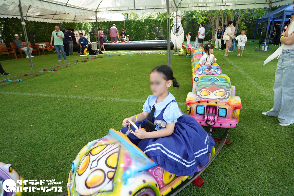 芝生エリアでは回転する飛行機型の乗り物やカラフルなミニ電車などが人気で、順番を待ちながら乗り物を楽しむ子どもたちの姿も見られました。