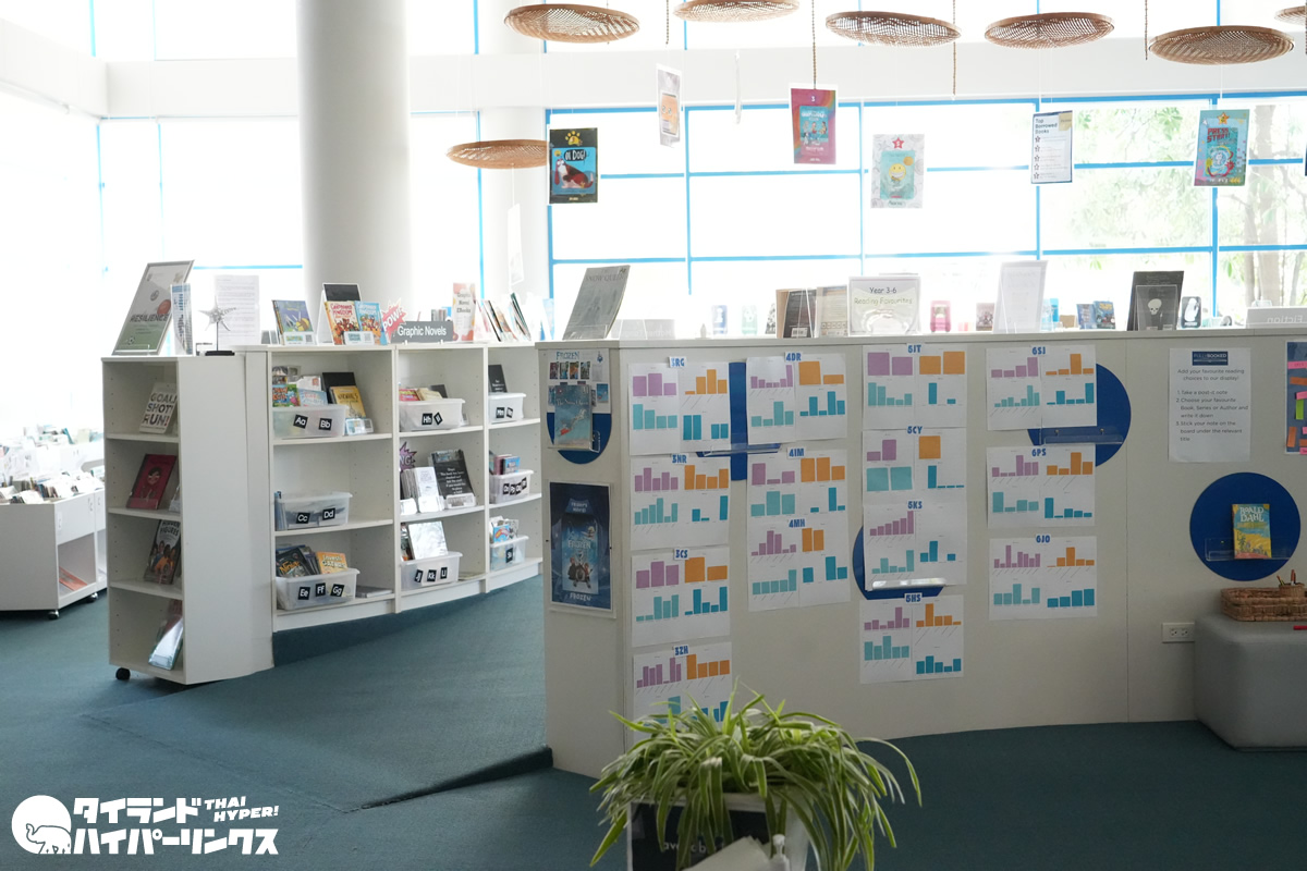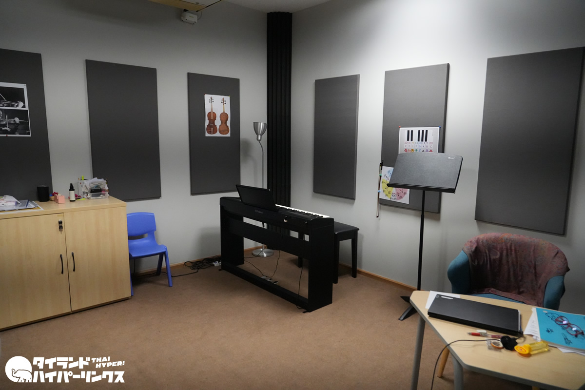 また、イベントの合間に校内を歩くと、明るく開放的な図書スペースや音楽室などの施設も目に入りました。図書スペースには多くの本が並び、落ち着いて読書できる環境が整っている様子。音楽室には電子ピアノや防音パネルなどが備えられており、音楽教育の設備も充実しているようでした。