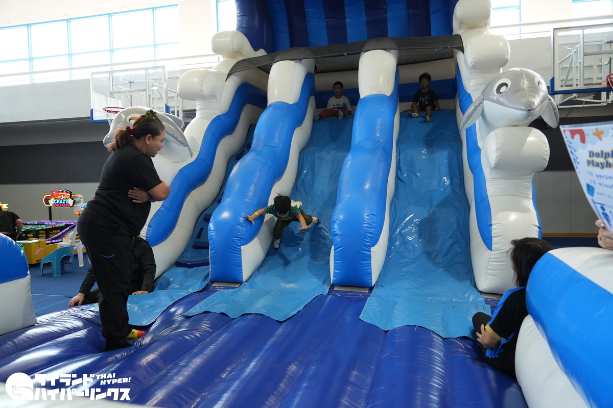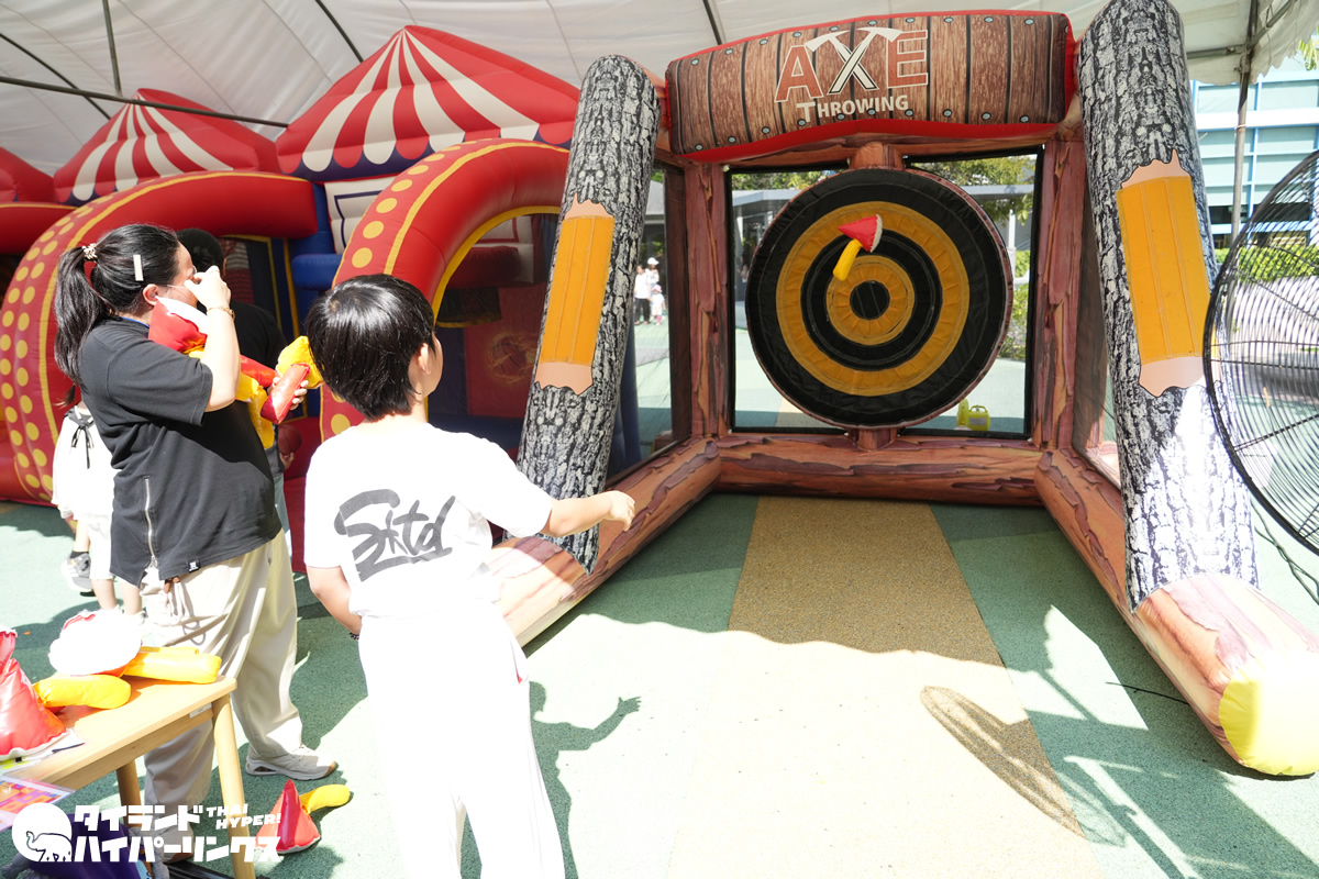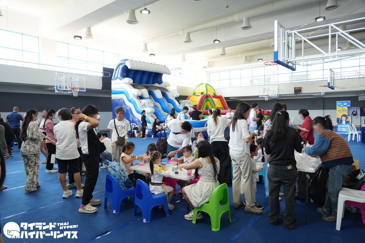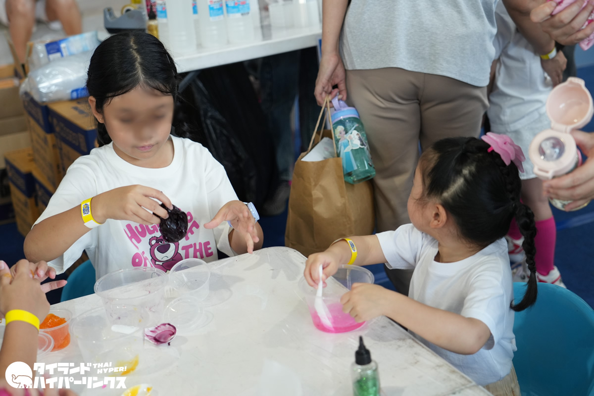 屋外は日差しが強く暑さを感じる時間帯もありましたが、エアコンの効いた体育館内には大型のエア遊具やワークショップのコーナーも用意されていました。ワークショップではスライム作りなどの体験も行われ、夢中になって制作を楽しむ子どもたちの姿が印象的でした。