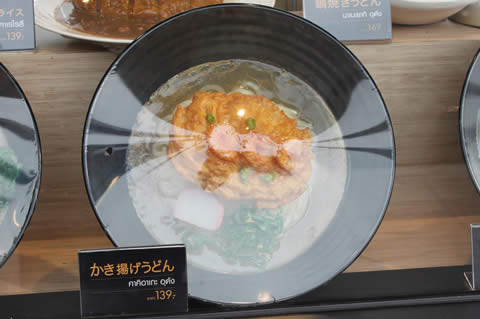 メニューのひとつのかき揚げうどん(139バーツ)。