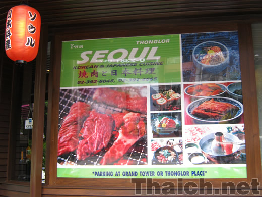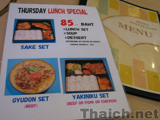 トンローにある焼肉&日本料理の店ソウル(SEOUL)に行った。ランチセットは焼肉・牛丼・鮭(それぞれ85バーツ。サービスと税金含めて99バーツ)があった。