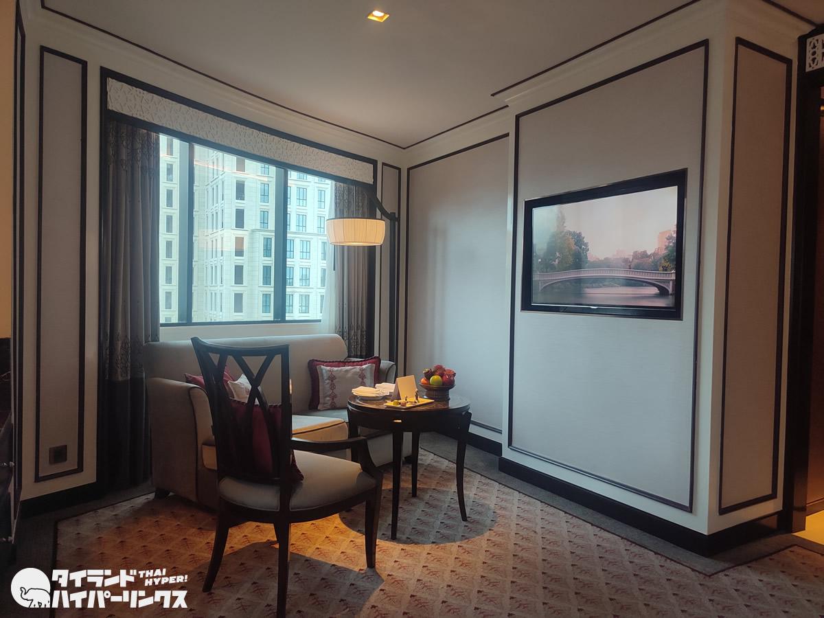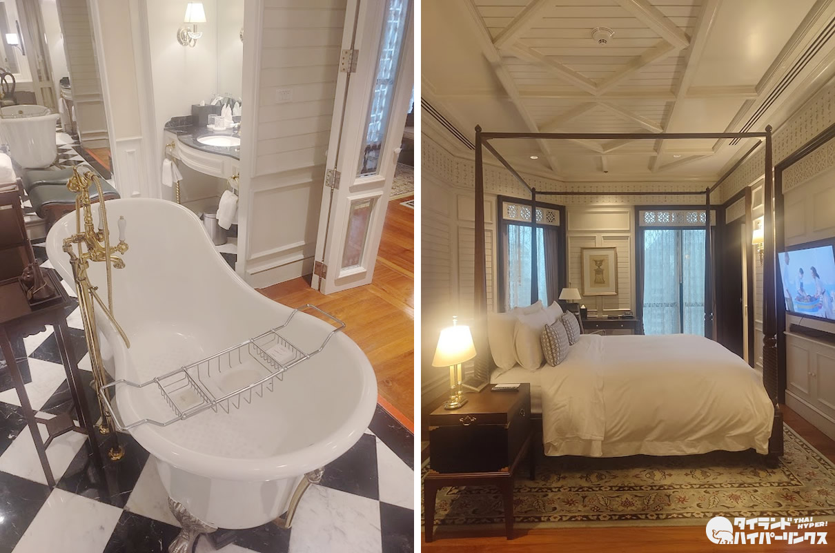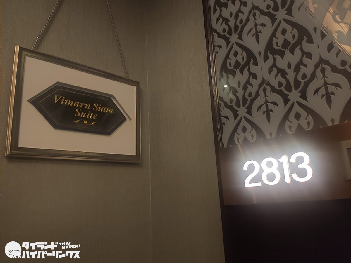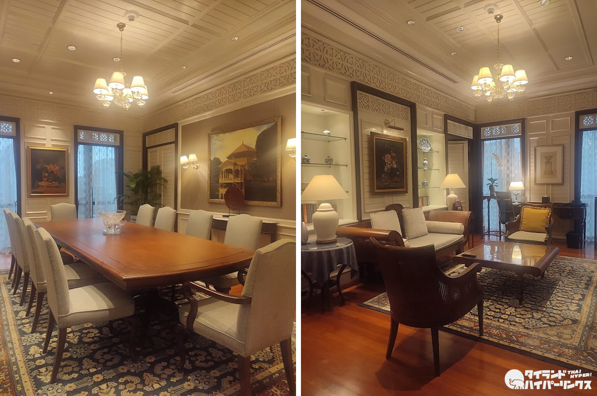 その中でも一際素敵だったのが、ヴィマンサイアムスイート(Vimarn Siam Suite )。公式サイトに「ラマ5世の夏の宮殿の建築要素を取り入れており、19世紀のヨーロッパと東洋、両方の装飾が調和しています。 印象的な2ベッドルームスイートは、10人掛けの豪華なダイニングテーブル、贅沢なシルク、見事な壁画、繊細で美しい彫刻と豊かな木の素材が際立ちます。」とあるように、いつかは泊まってみたい贅沢な客室でした。