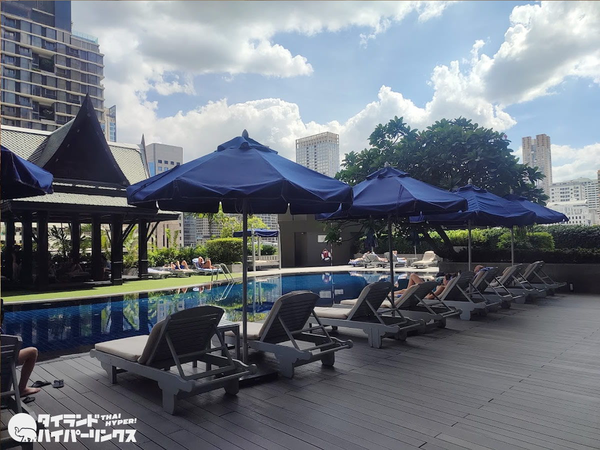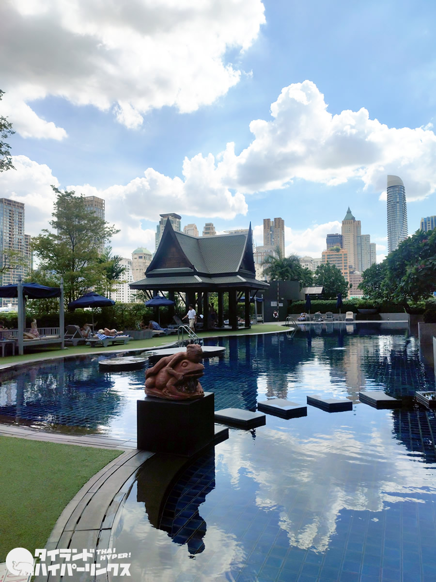 バンコクの高層ビルが眺められる庭園のようなプール。その横には庭があり、犬を散歩させることもできるのだとか。ちなみに「アテネホテル」は7キロ未満のペットと滞在可能。1部屋につき1匹までだそうです。
