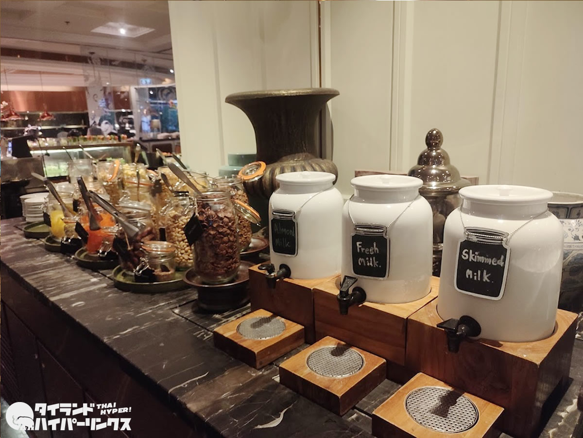 シリアルのコーナーでは、ミルクも3種類から選ぶことができます。アーモンドミルクとフレッシュミルクとスキムミルクが選べます。