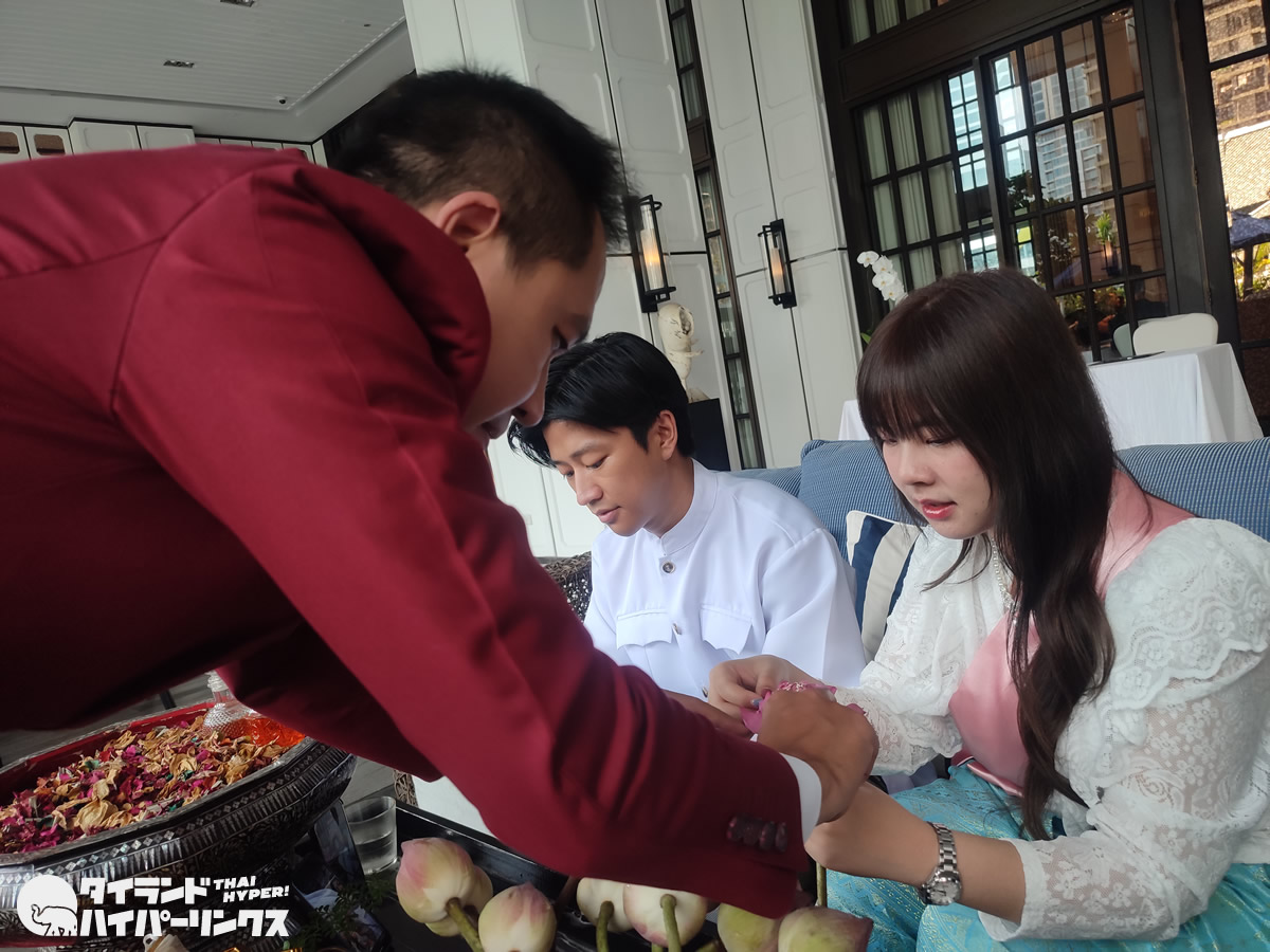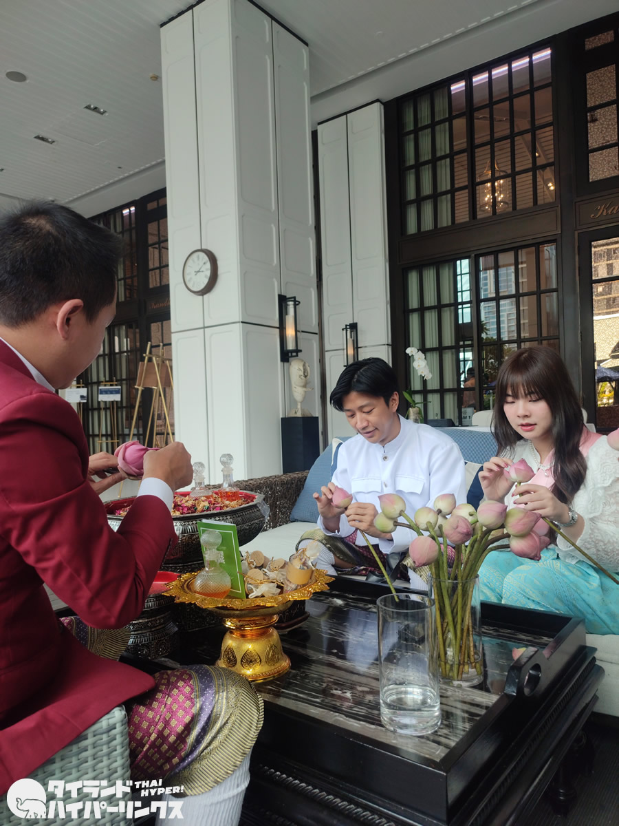 「アテネホテル」に宿泊すると、クッキングやムエタイを始め、タイの文化を体験できる様々な無料のクラスに参加できます。この日は、蓮の花を折るロイヤルアートとポプリ作りでした。