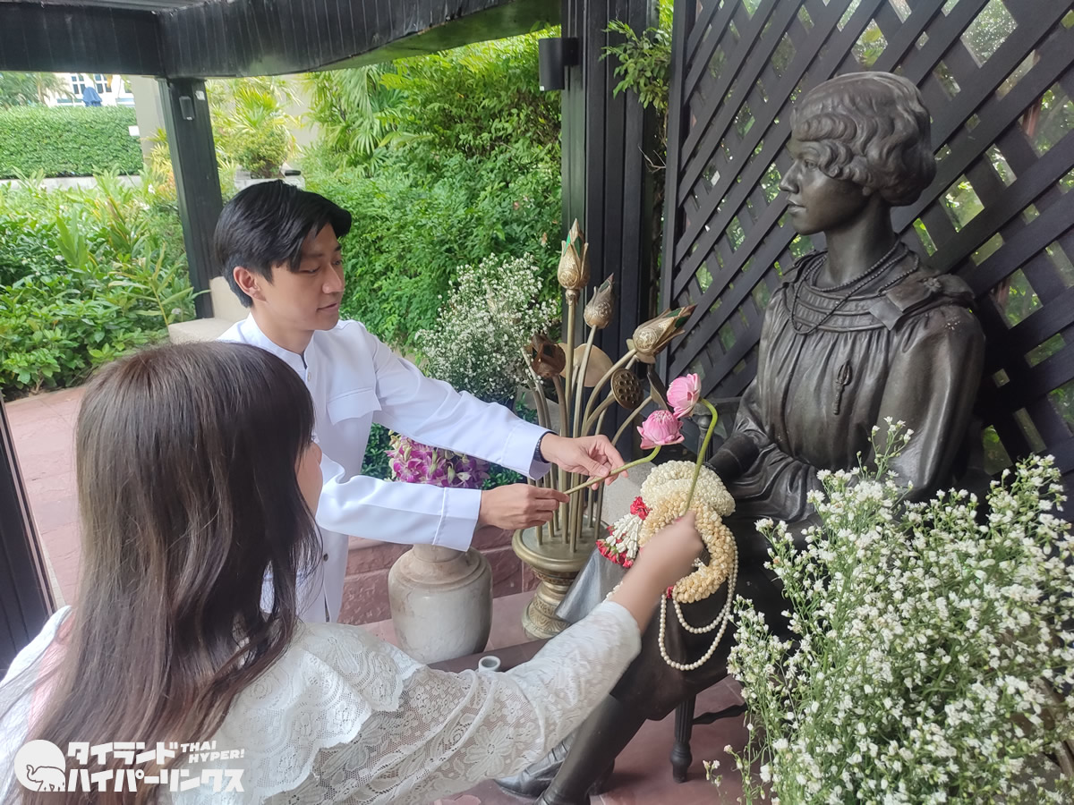 作ったロイアルアートは、プールの横にある庭の像に供えます。