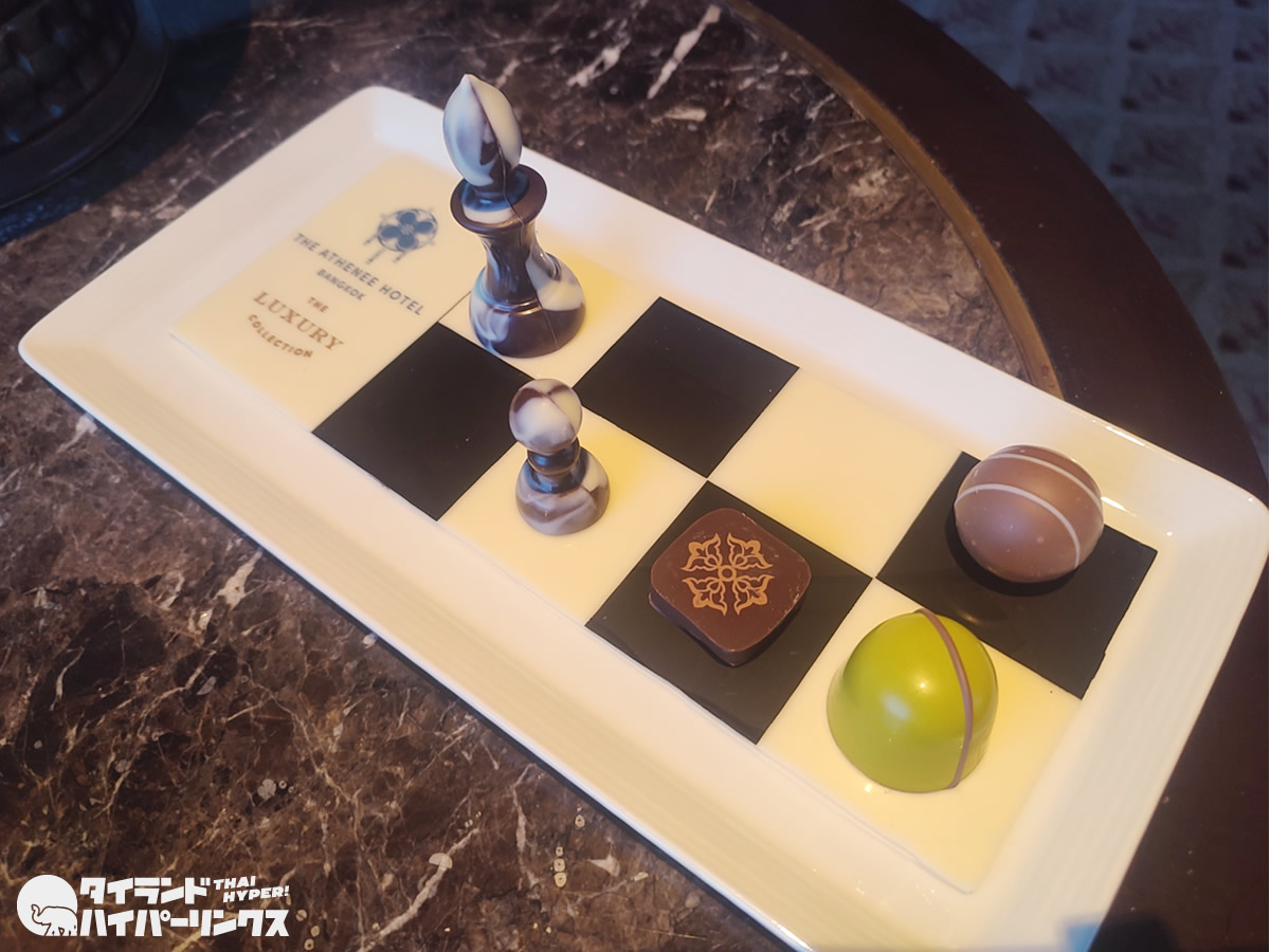 ウエルカムフルーツの横には、チェス型のチョコレート。