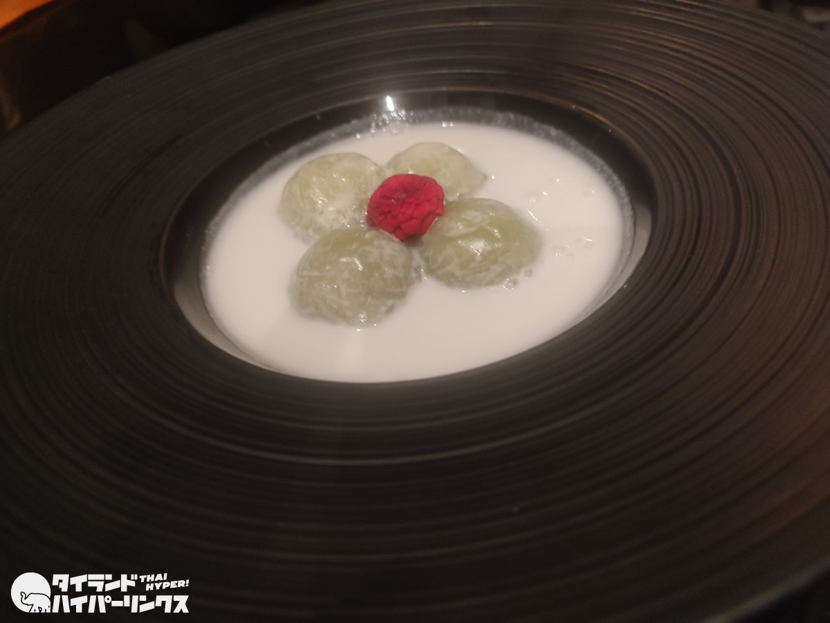そして温かいココナッツミルクにライスボールが入った「ขนมโคกะทิสด(カノムコーガティソード)」(310バーツ)でタイの伝統スイーツを満喫したのでした。