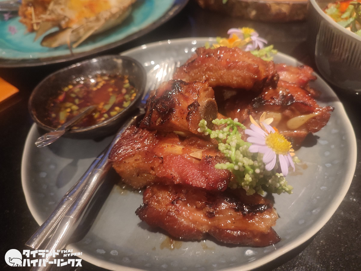 この肉の塊が「ซี่โครงหมูย่าง(シークローンムーヤーン)」(550バーツ)。マリネしたポークスペアリブの炭火焼きで、イサーンと呼ばれるタイ東北地方のチリソースが添えられています。