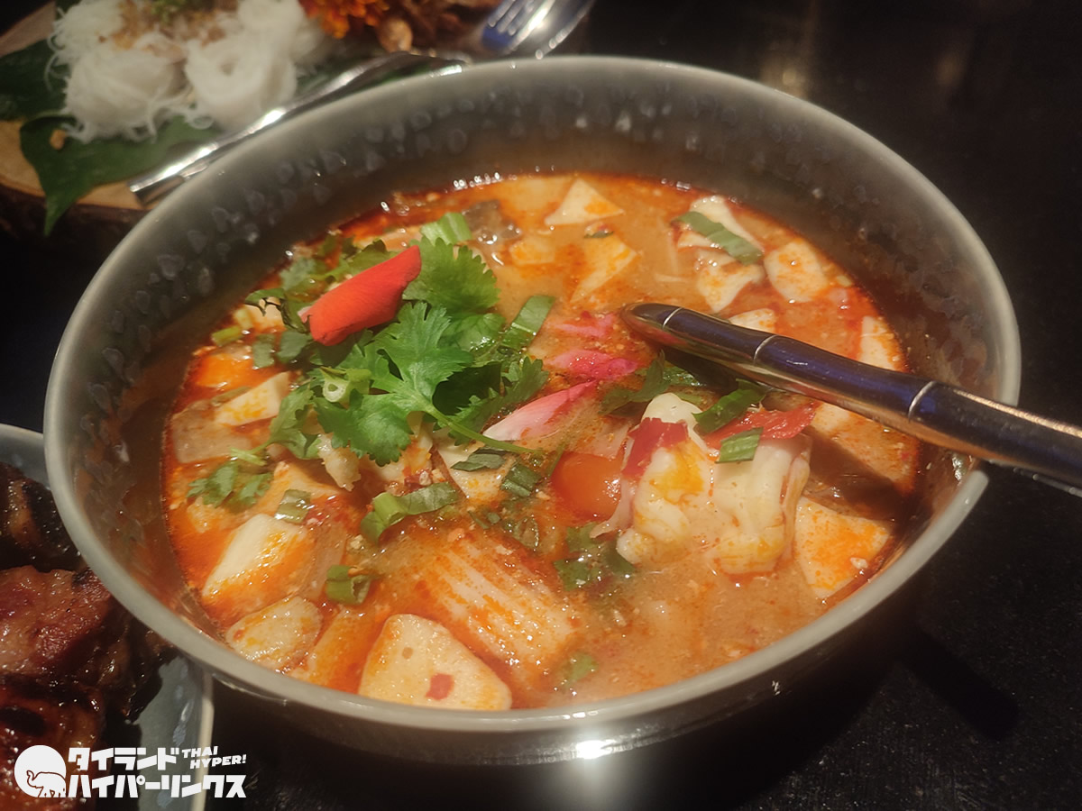 皆さんも御存知のトムヤムクンにココナッツが入った「ต้มยำกุ้งมะพร้าวอ่อน(トムヤムクンマパオオーン)」(620バーツ)。海老がたっぷりなのが贅沢ですね。