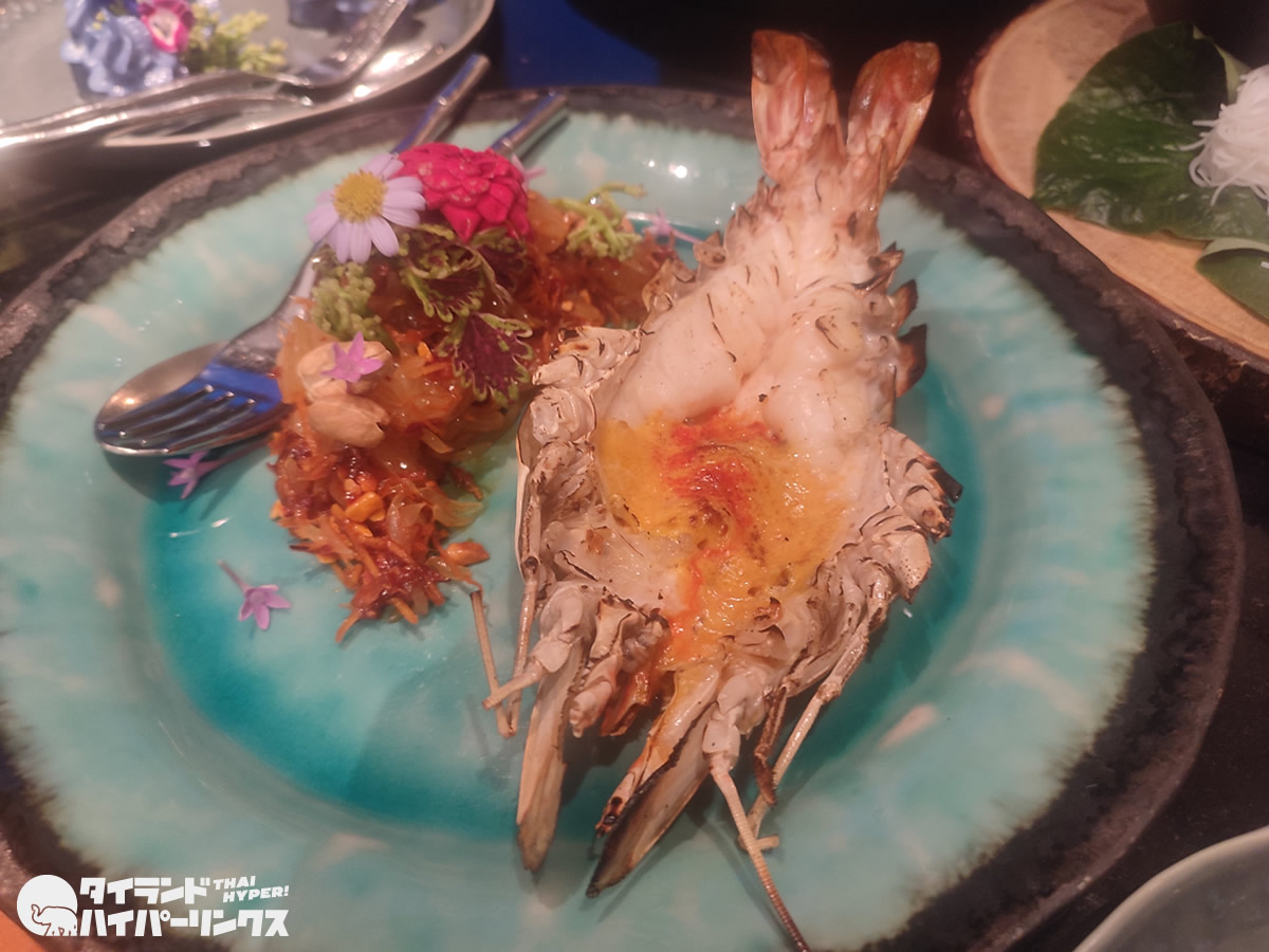 「ยำส้มโอทองดีกุ้งแม่น้ำอยุธยาเผา(ヤムソムオー トーンディークンメナムアユタヤパオ)」(580バーツ)は、ポメロサラダに焼いたアユタヤ海老が添えられたもの。
