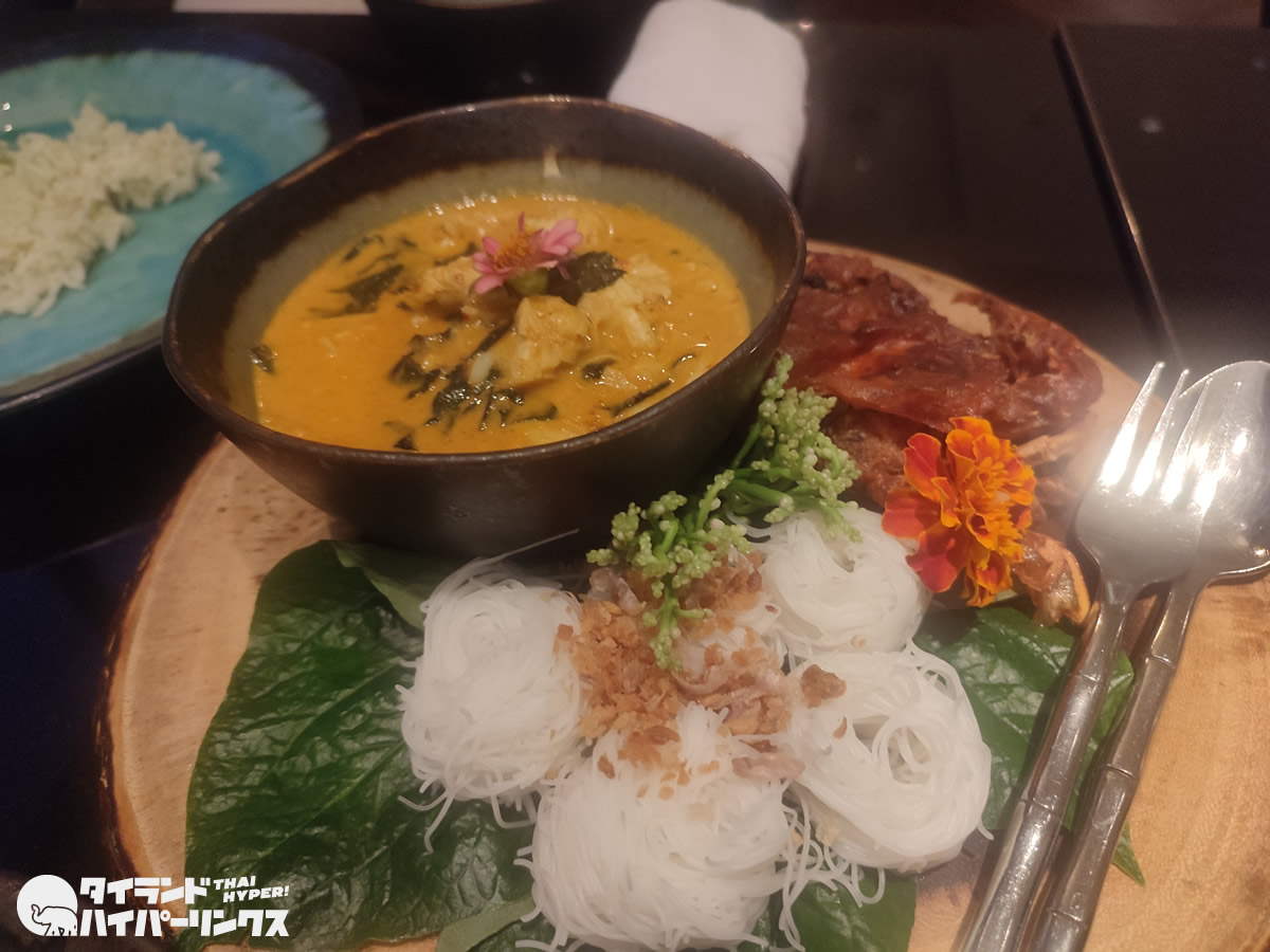 料理はどれも美しく、これは「แกงปูใบชะพลู(ゲーンプーバイチャプルー)」(650バーツ)というカニたっぷりのスープ。横に添えられたのは、カノムチンという米粉麺です。