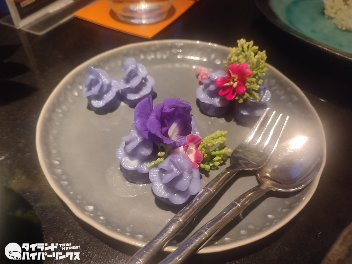 この美しい「ช่อม่วงปลาช่อนนา(チョームアンプラーチョンナー)」(390バーツ)は、紫色の花の形をした自家製蒸し餃子の中に、有機スパンブリー産雷魚のマリネを詰めたものです。