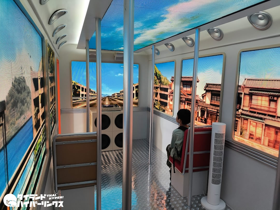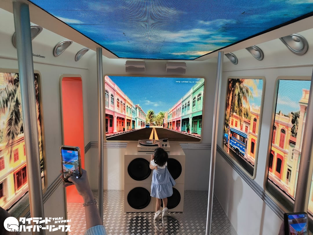 中でも最大の見どころが、バス型の没入型インスタレーションです。レトロな外観のバスに乗り込むと、窓がスクリーンとなり、日本やイタリアなど世界各国の風景が映し出されます。