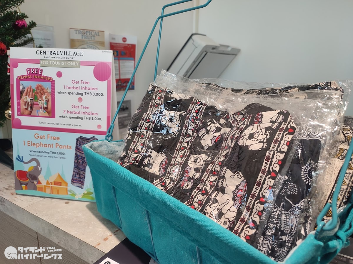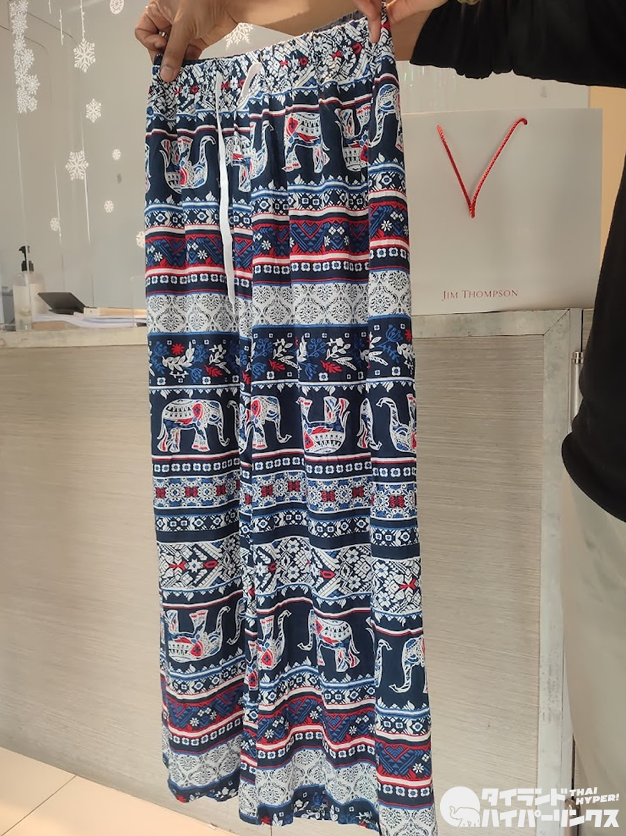 履き心地が良くてかわいいと人気のタイパンツは、8000バーツ以上の購入でプレゼント。窓口でレシートを見せてください。