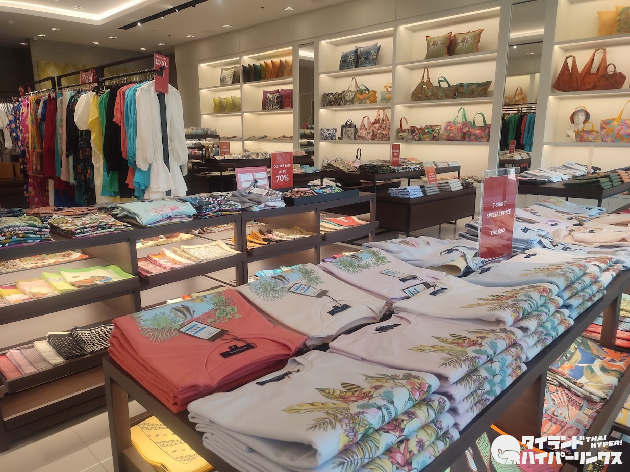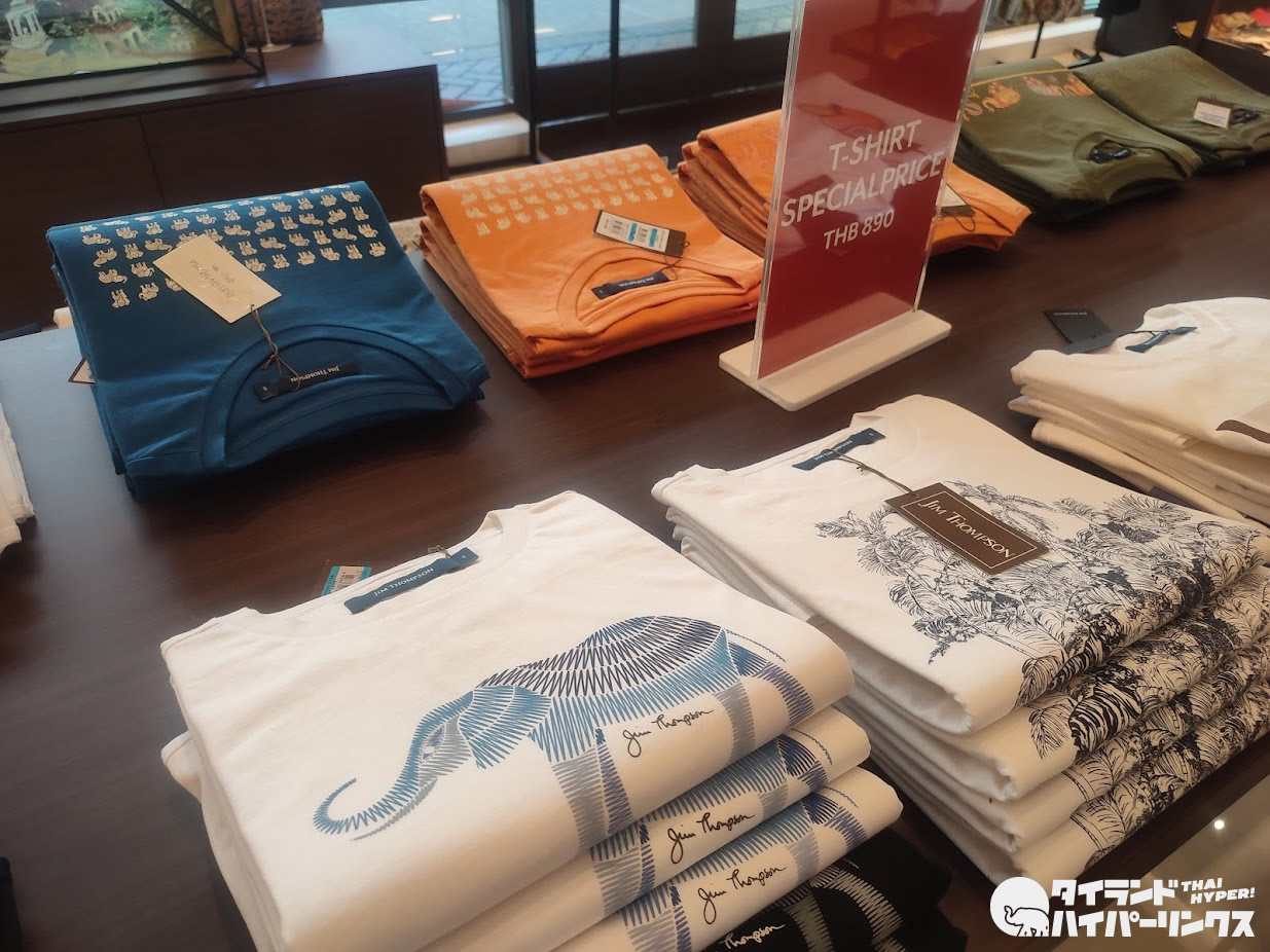 実は、毎回ここを訪れています(笑)。タイシルク製品の「JIM THOMPSON(ジムトンプソン)」。最大で7割引で、Tシャツやスカーフはお土産にぴったりかも。