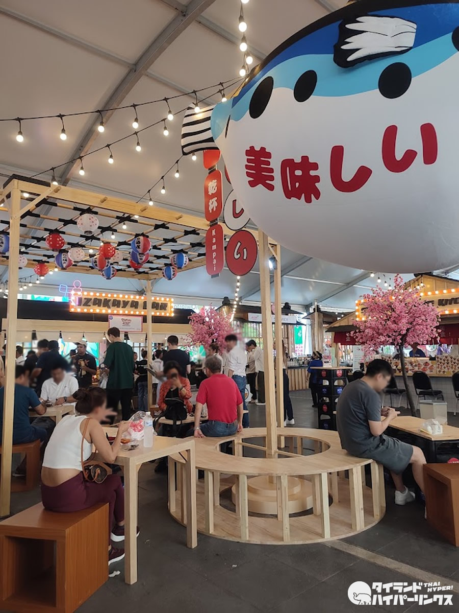 日本の美味しいものが集結したのは、セントラルワールド前の広場。猛暑のバンコクですが、会場は屋根があって風通しが良くて意外に涼しく、冷たいドリンクもたくさん種類があるので喉を潤しながらお祭り気分で、暗くなれば夜市気分で楽しめるはず。お酒の味見や試食をしながら「ジャパン シグネチャー 2024」の会場を巡ってみました。