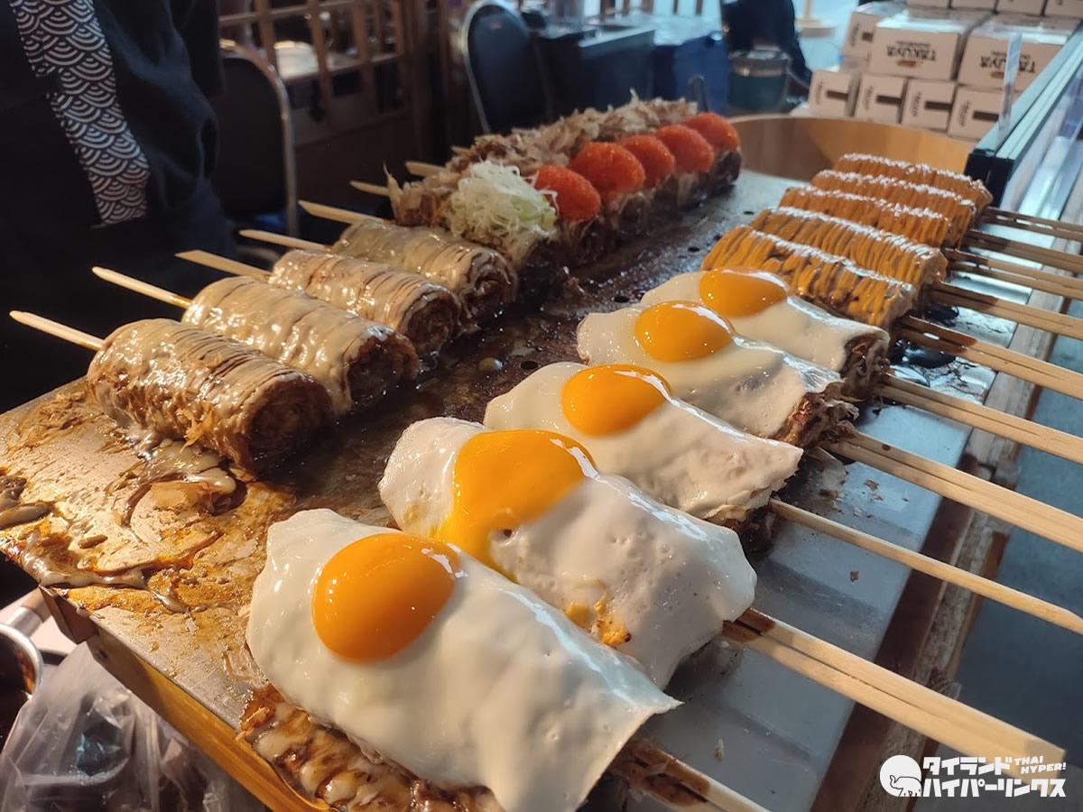 串スタイルのお好み焼き。ソースの良い香りが漂ってきます。