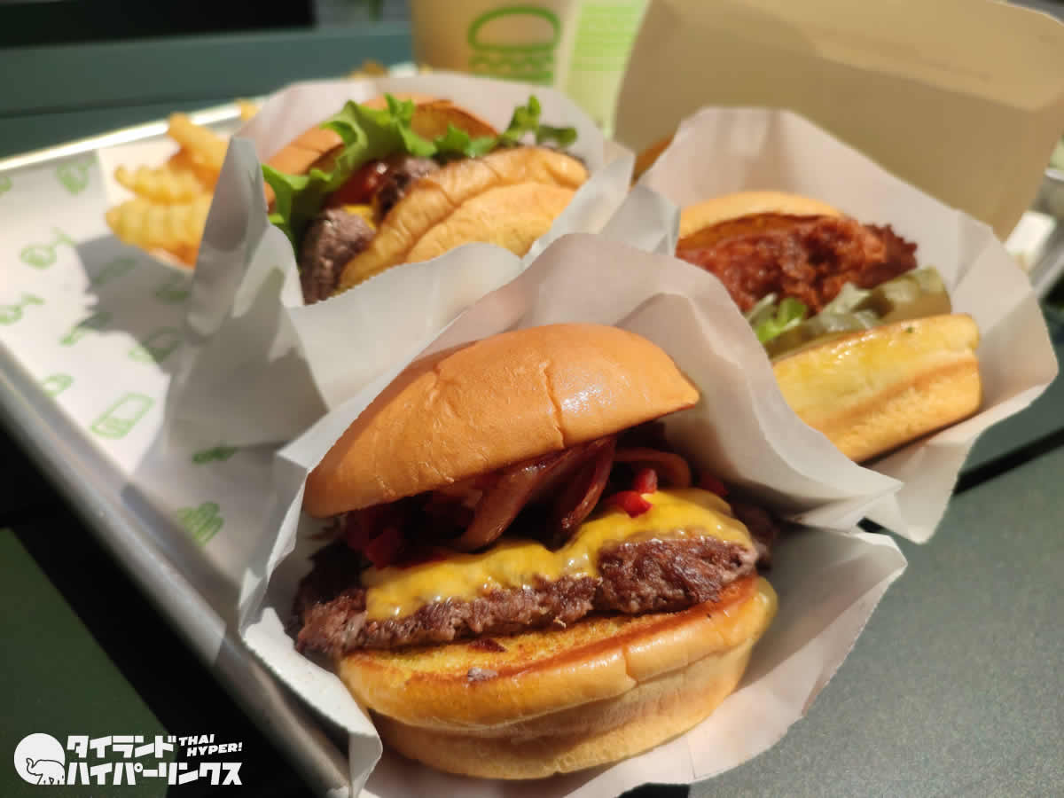 「シェイクシャック」は日本でも東京の都心を中心に13店舗を展開する話題のンバーガーショップで、タイではセントラルワールドの店舗が1号店。3月30日にオープンしたばかりで、行列のできる店となっています。