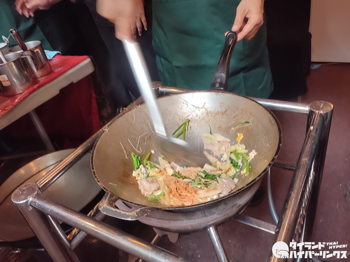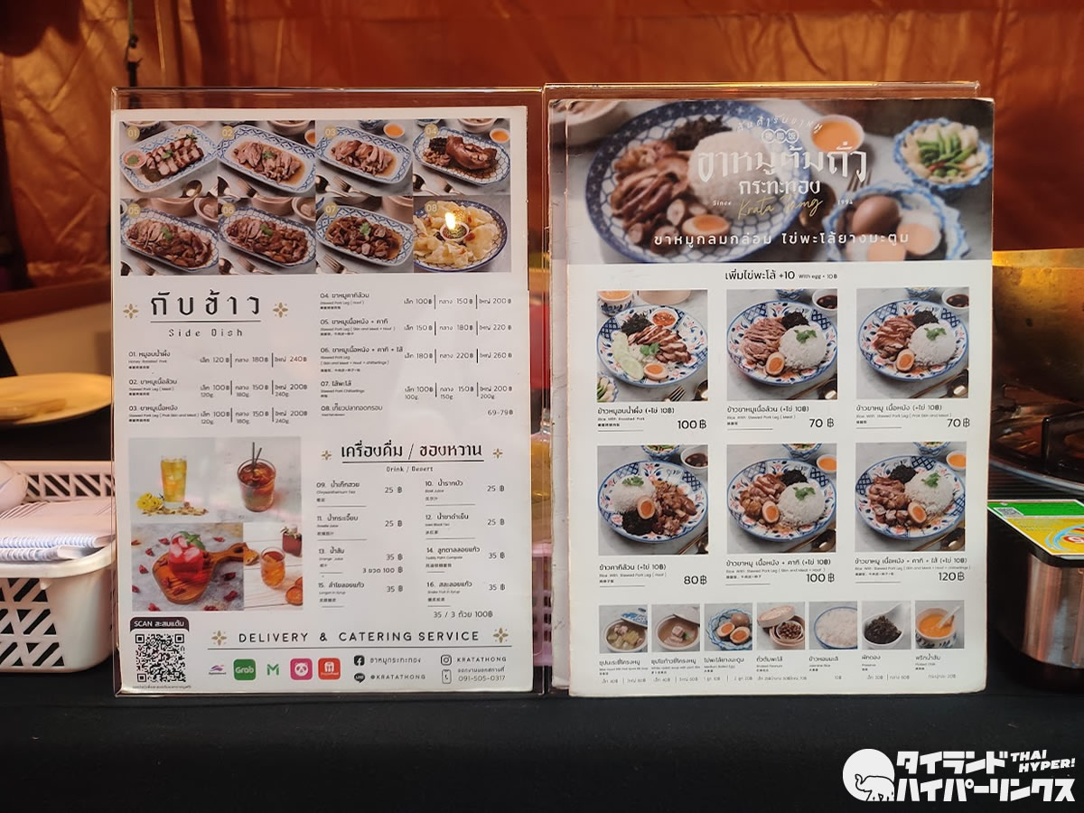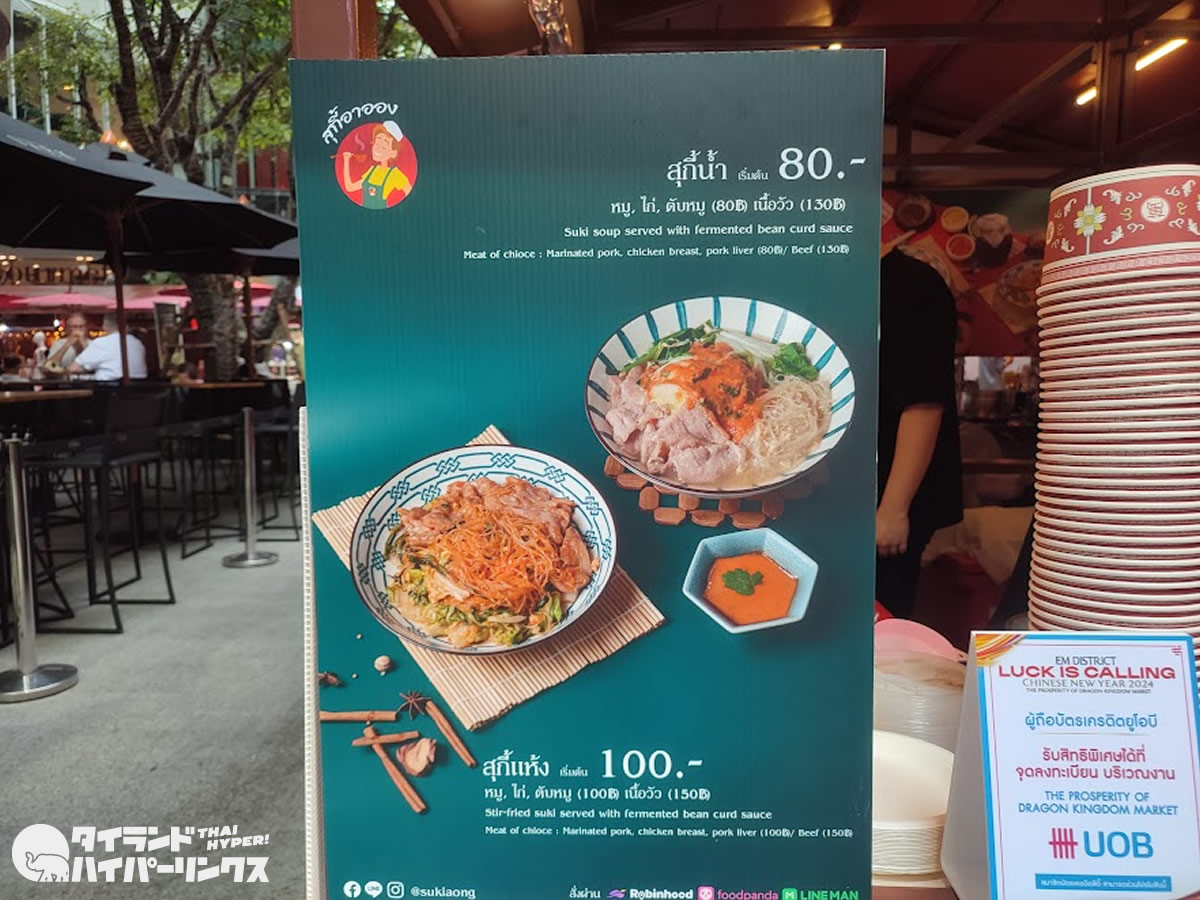 こちらはタイスキのお店。タイスキとは野菜やお肉など具材がたっぷりはいった鍋のことで、汁ありと汁なしが選べます。「鍋なのに汁なし?」と思う人もいるでしょうが、美味しいのでぜひお試しを!汁ありが80バーツで汁なしが100バーツです!