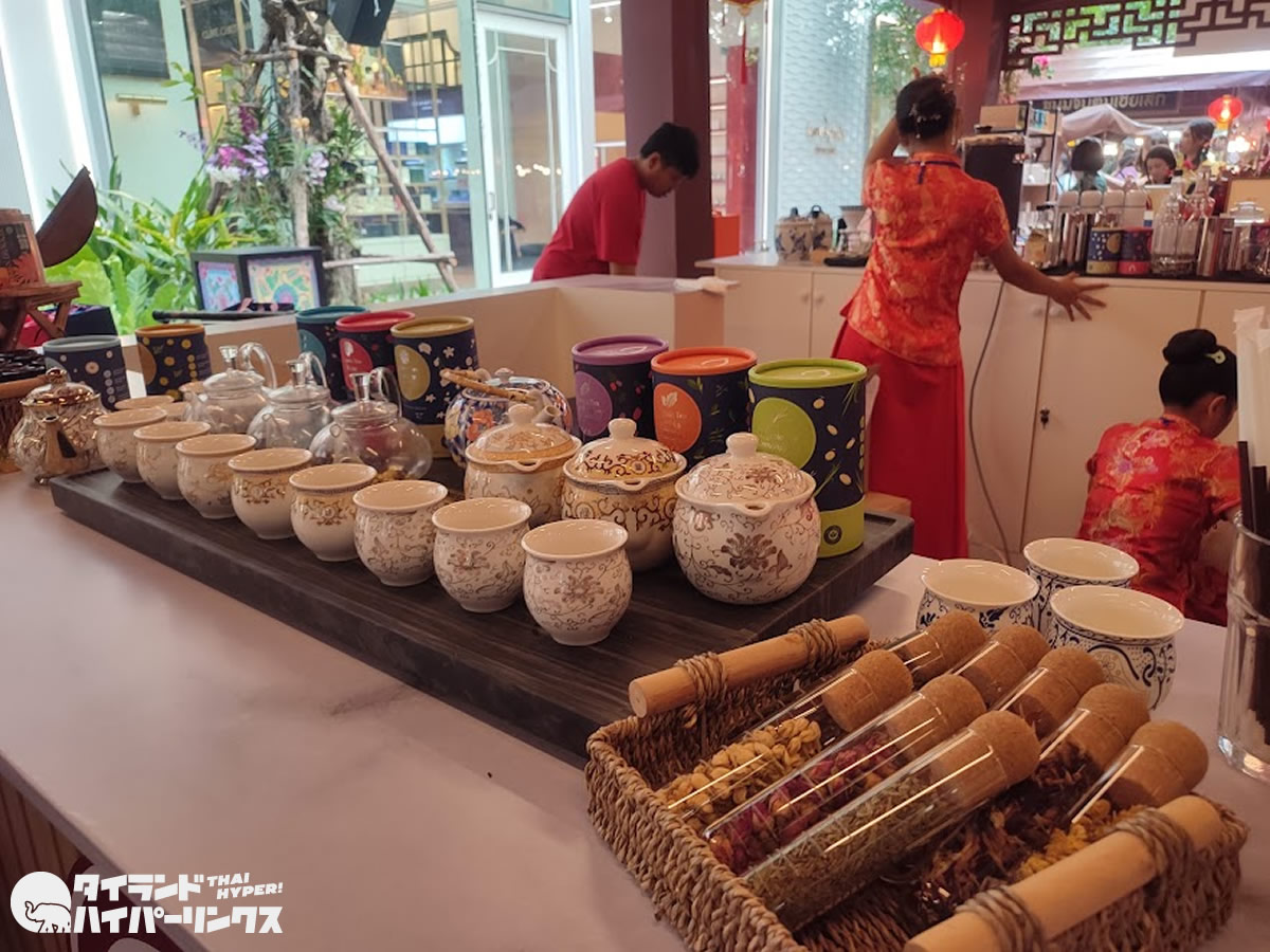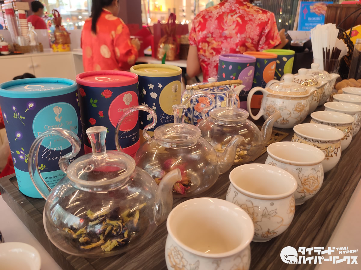まずは会場のセンターを陣取るのが、お茶を販売しているこちら。可愛くパックされたお茶やハーブのお茶が並び、急須や湯呑などもそろい、まるでここは中国茶のテーマパーク。
