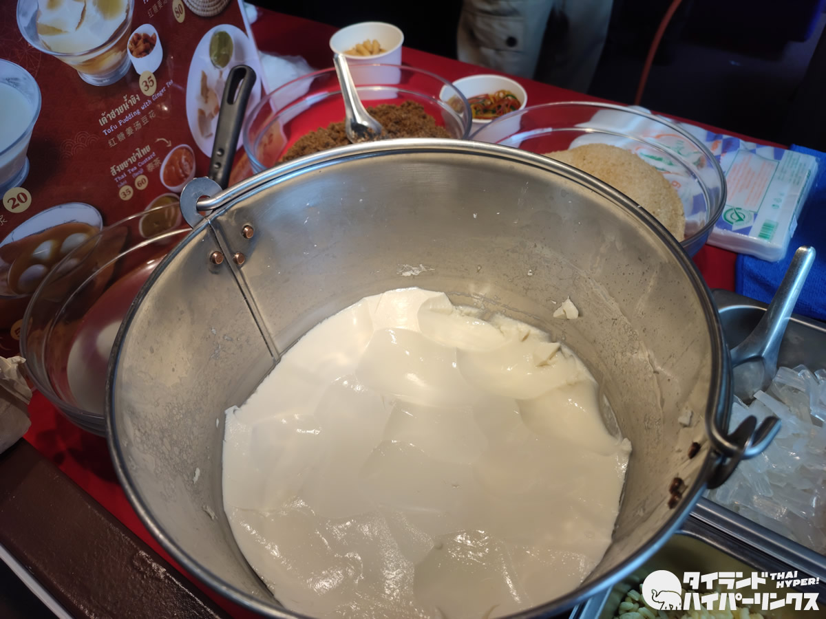 続いて甘いもの。ここでは甘いクリームをたっぷり付けていただくパンと豆乳と豆腐を販売。豆腐は醤油をかけて食べるのではなく、甘い生姜の汁などでいただくデザートですね。