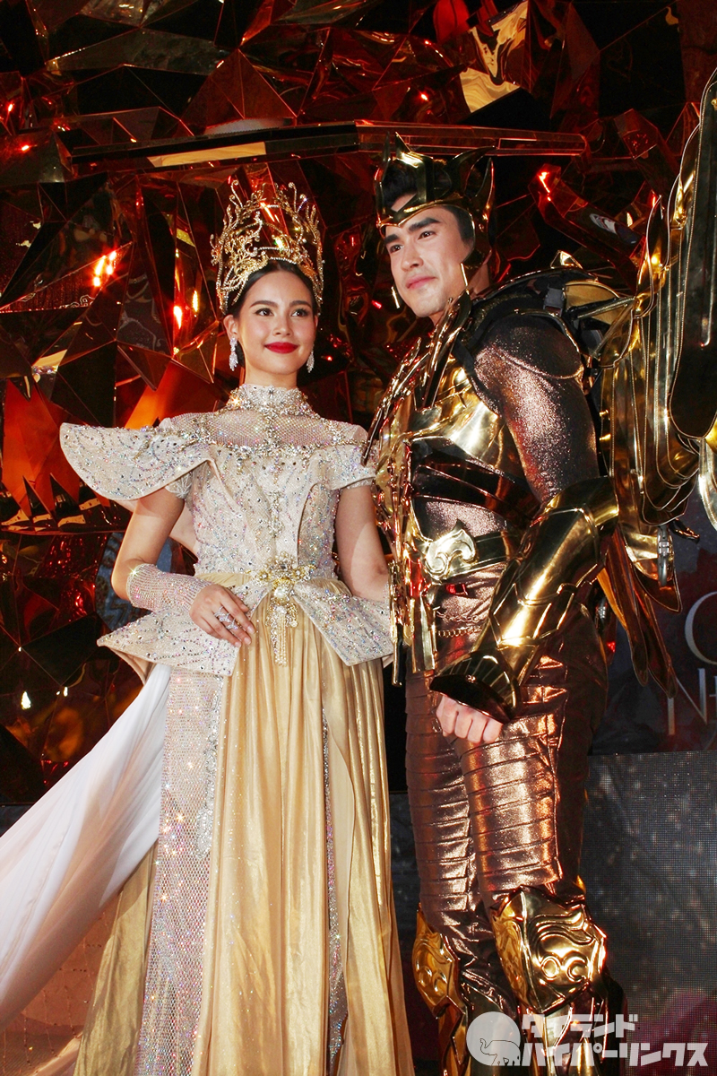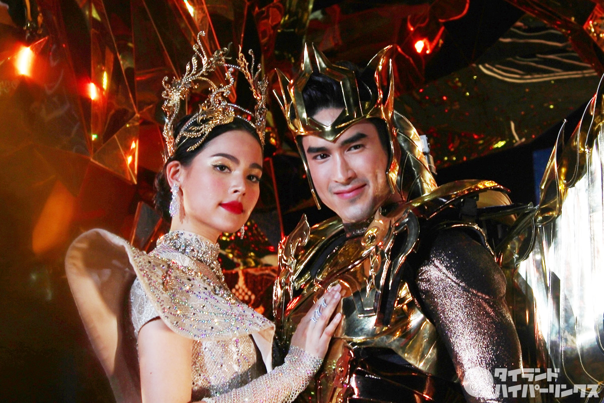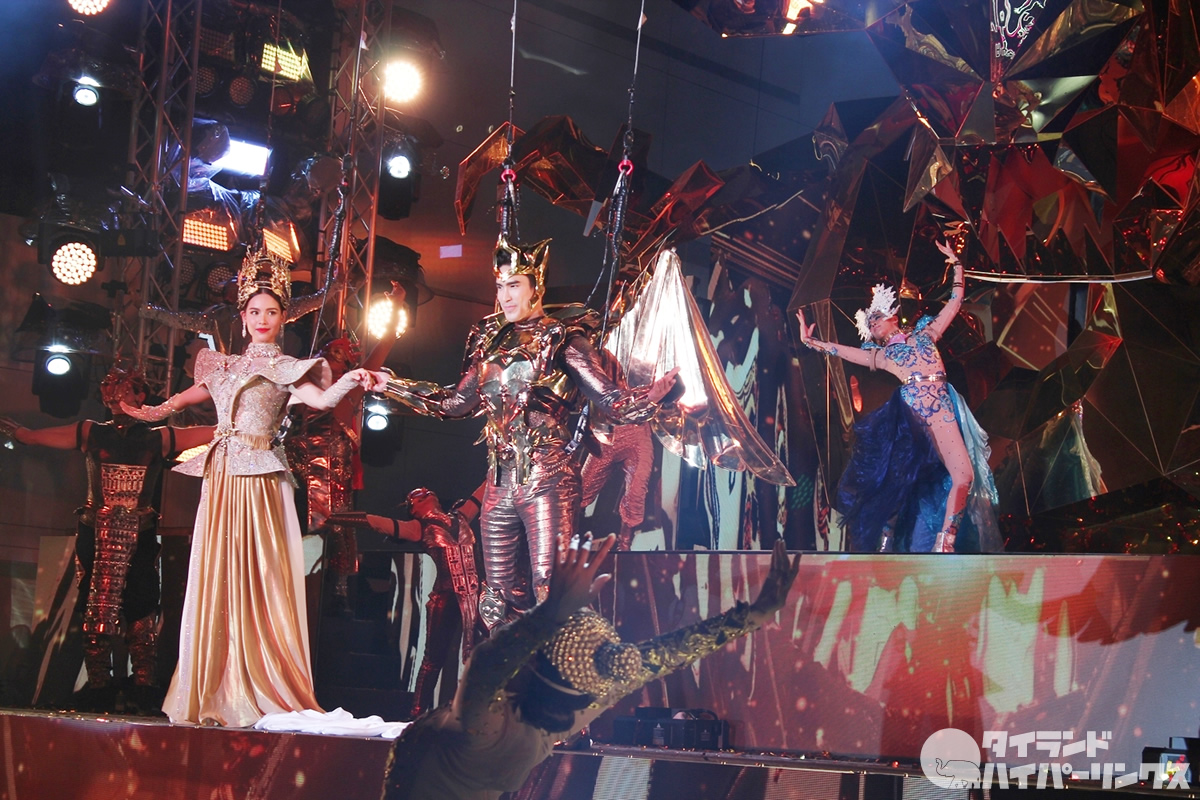 春節のために作られた高さ40メートル以上のゴールデン・エンペラー・ドラゴンの前で、カップルとしても知られるトップ俳優のナデート・クギミヤさんとトップ女優のヤヤ・ウッラサヤーさんが上空から登場し、大勢の聴衆を沸かせました。