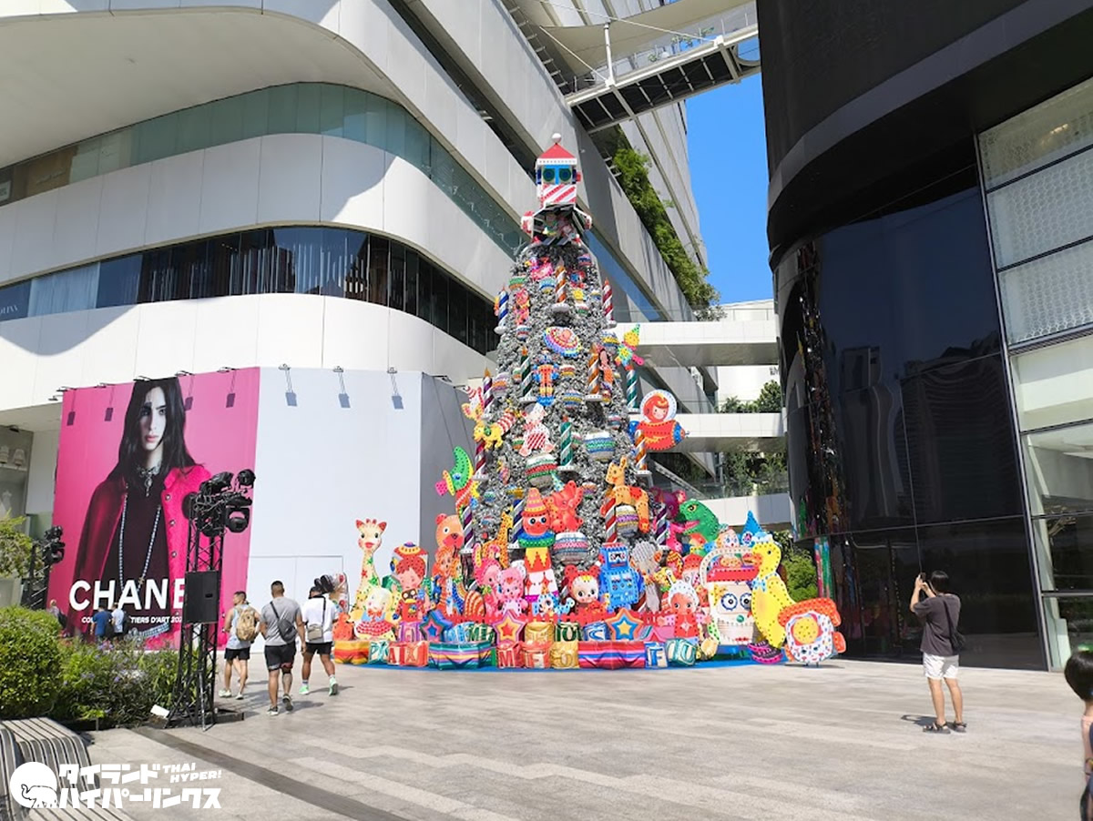 BTSプロムポン駅に直結するエムクオーティエの前のクリスマスツリー、駅を挟んで反対側がエンポリアム。