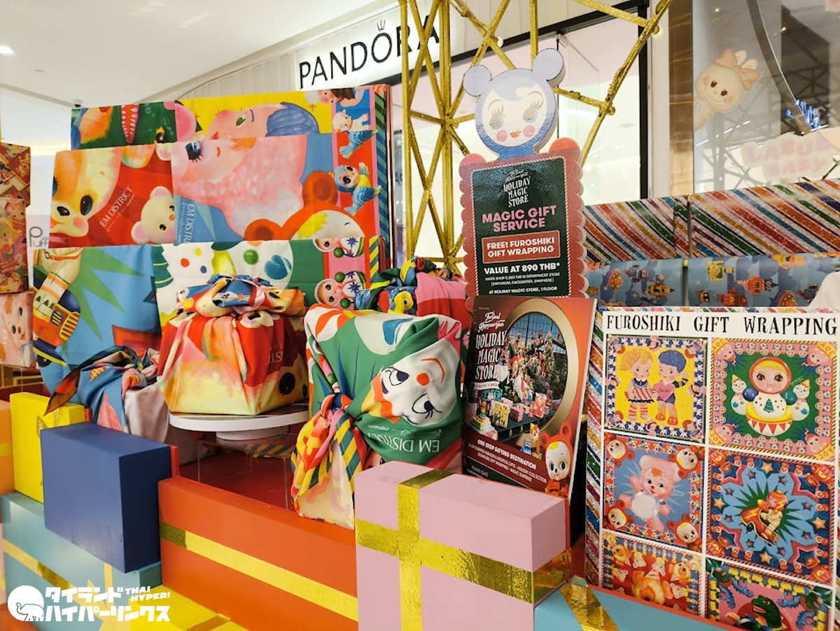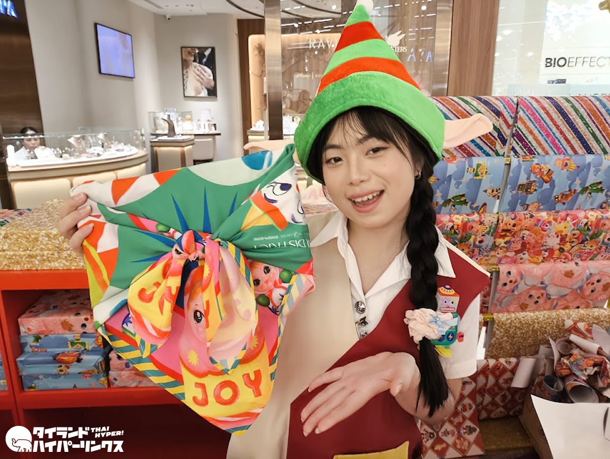 中でも注目なのが、風呂敷(FUROSHIKI)のサービスです。5000バーツ以上のお買い物で、かわいいデザインがプリントされた風呂敷でラッピング。6種類の中から好みのデザインを選べるそうです!