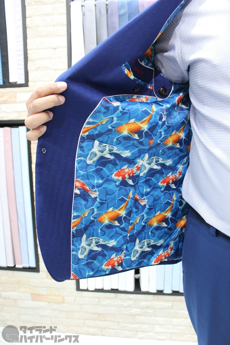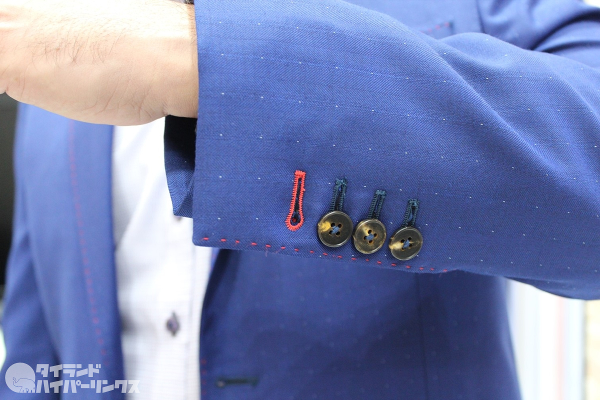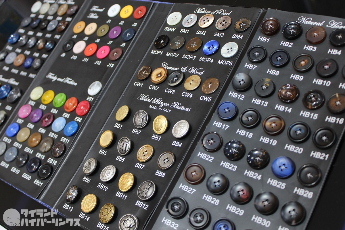 また、この店の別な特徴は素材の豊富さです。先述の最高級織物以外にも、ボタンやカフス、スーツの内側のライニングまで、バンコクで最も種類を揃えている店の一つです。そのため、自分自身の好みやライフスタイルを表す正に世界で1着だけのスーツを作ることができるのです。