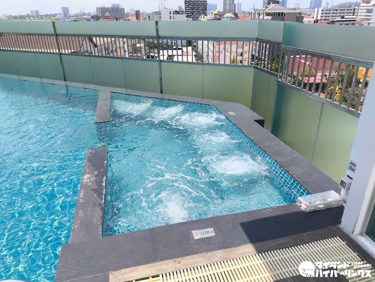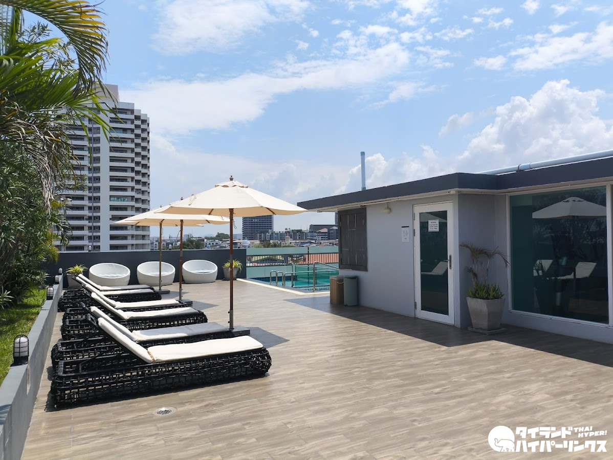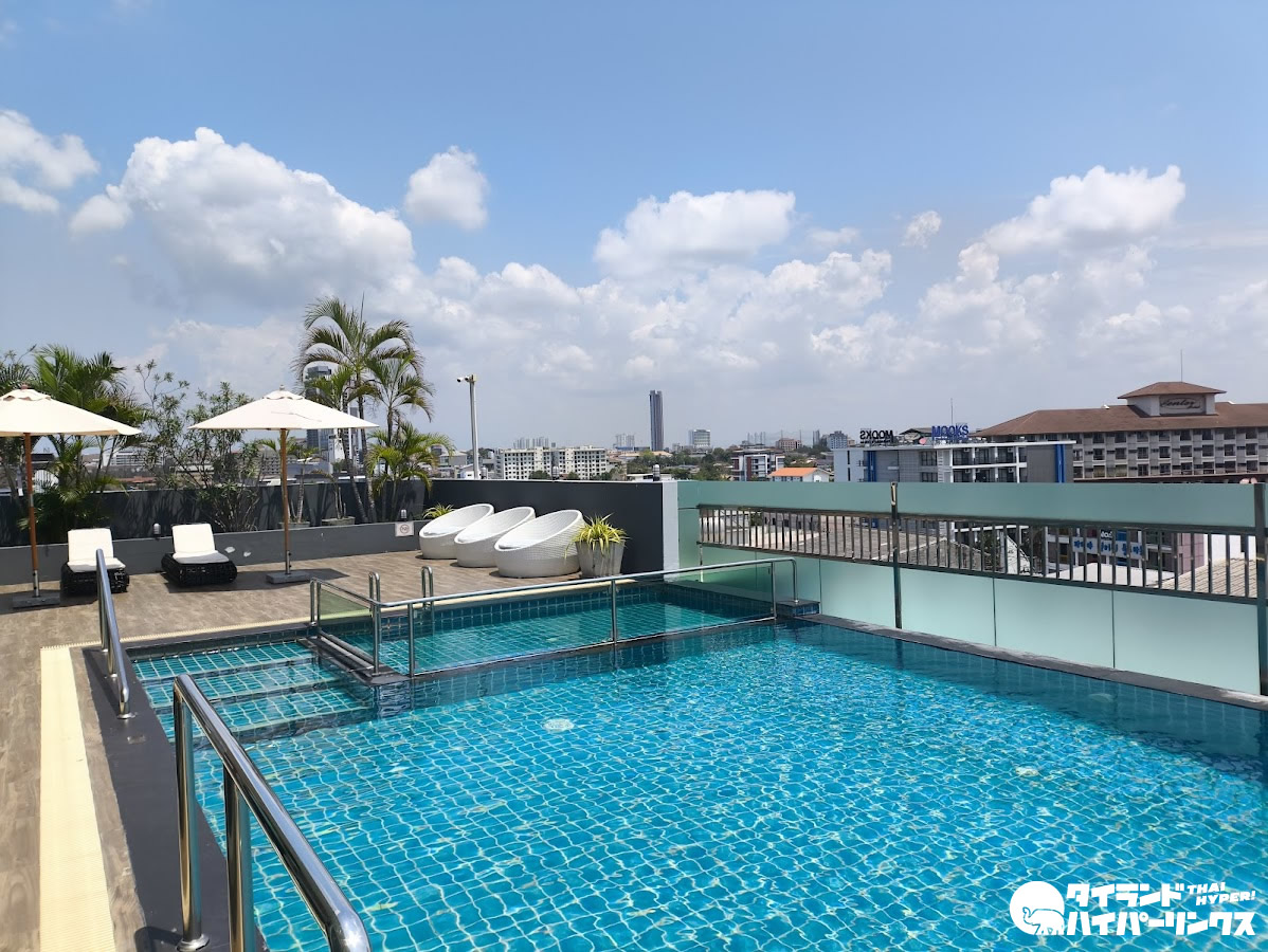 屋上にはパタヤの街並みを一望できるスカイプールを完備。水深は約1.2メートルで、気軽にリフレッシュできる空間となっています。日中はもちろん、時間帯によって異なる景色を楽しめるのも魅力です。