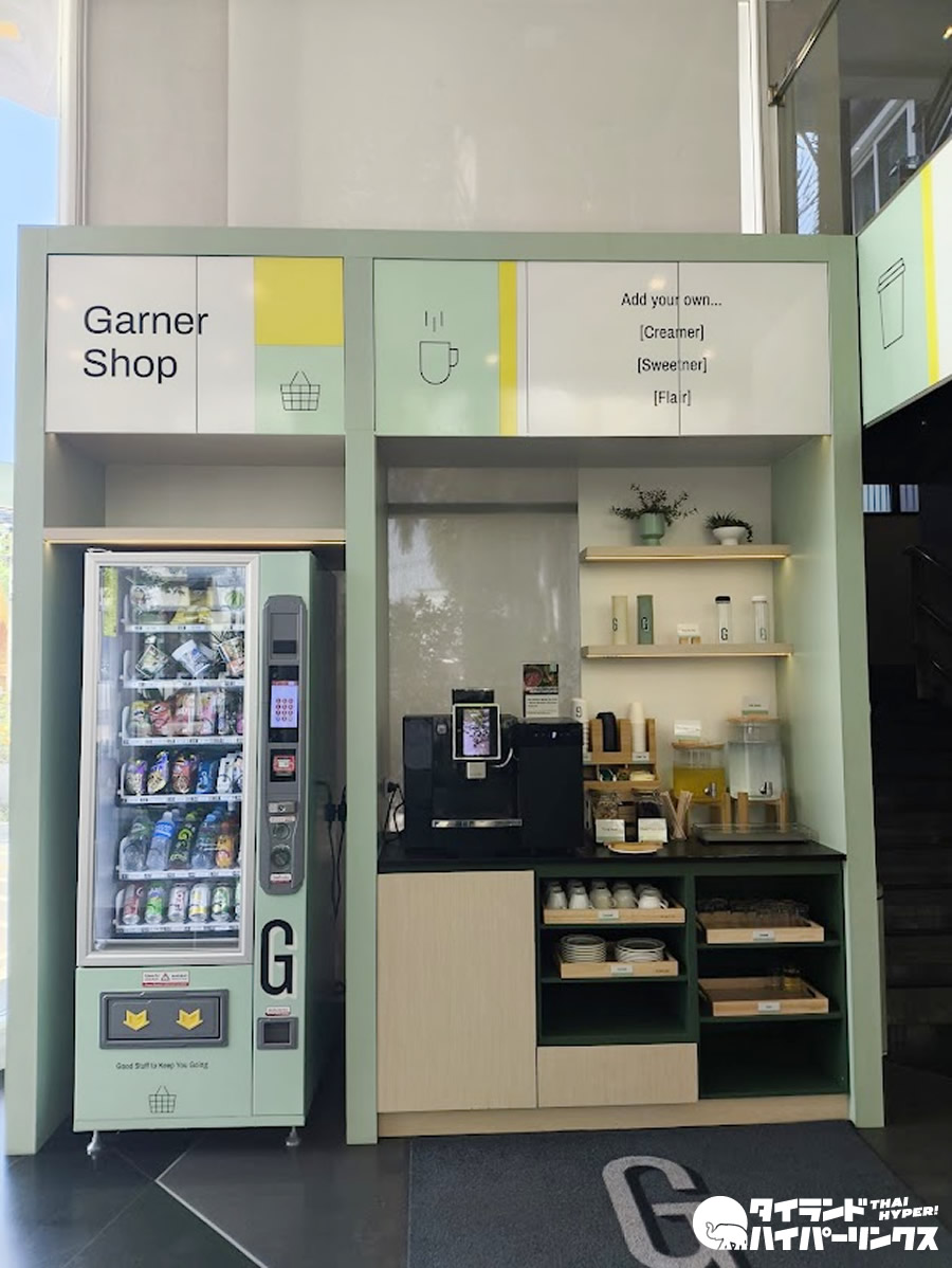 また、自動のコーヒーメーカーも設置されており、コーヒーやお茶を気軽に楽しめるほか、ちょっとしたスナックも用意されています。外出前や戻ってきた際にも立ち寄りやすく、使い勝手の良いサービスです。24時間利用可能。