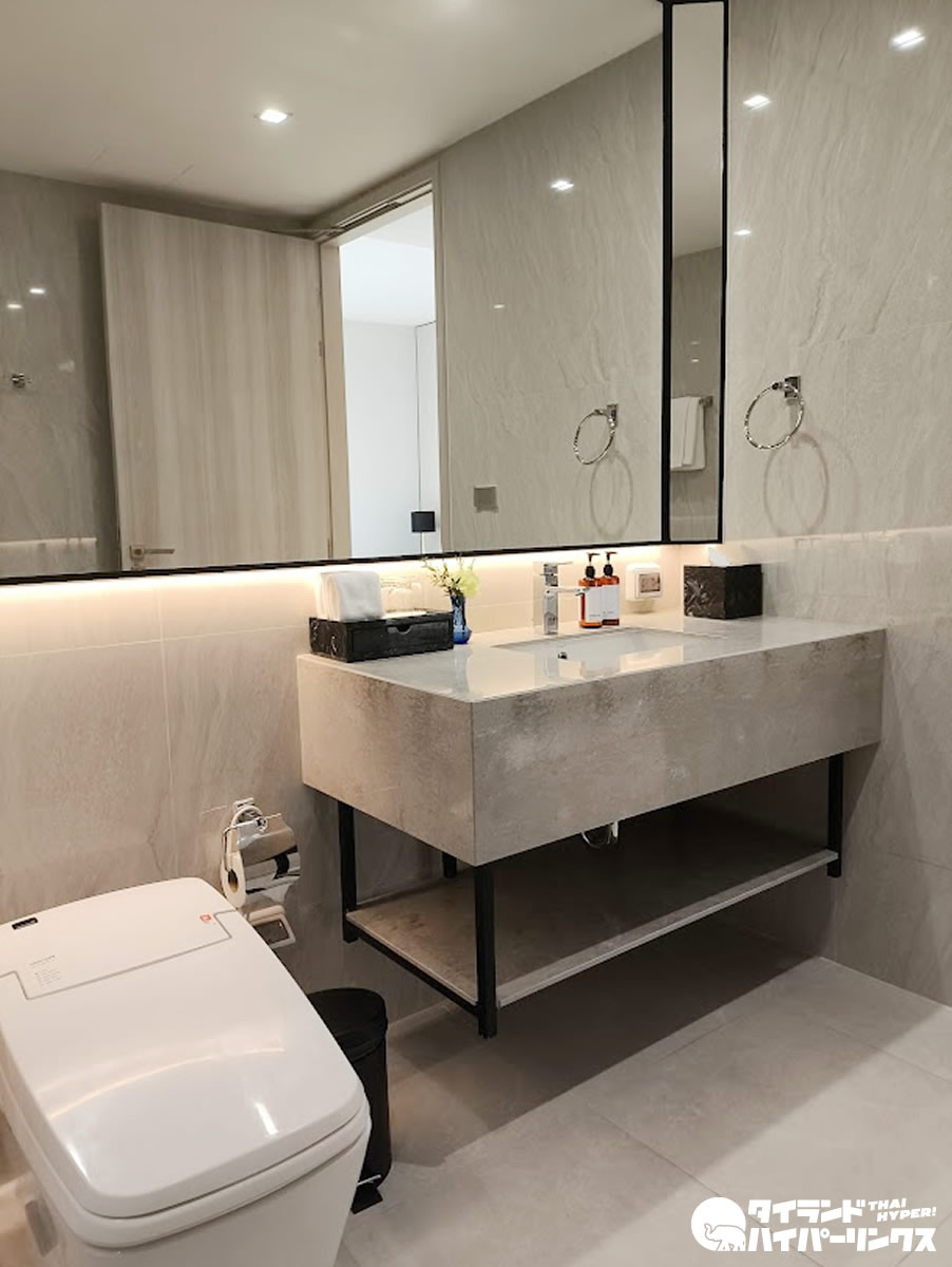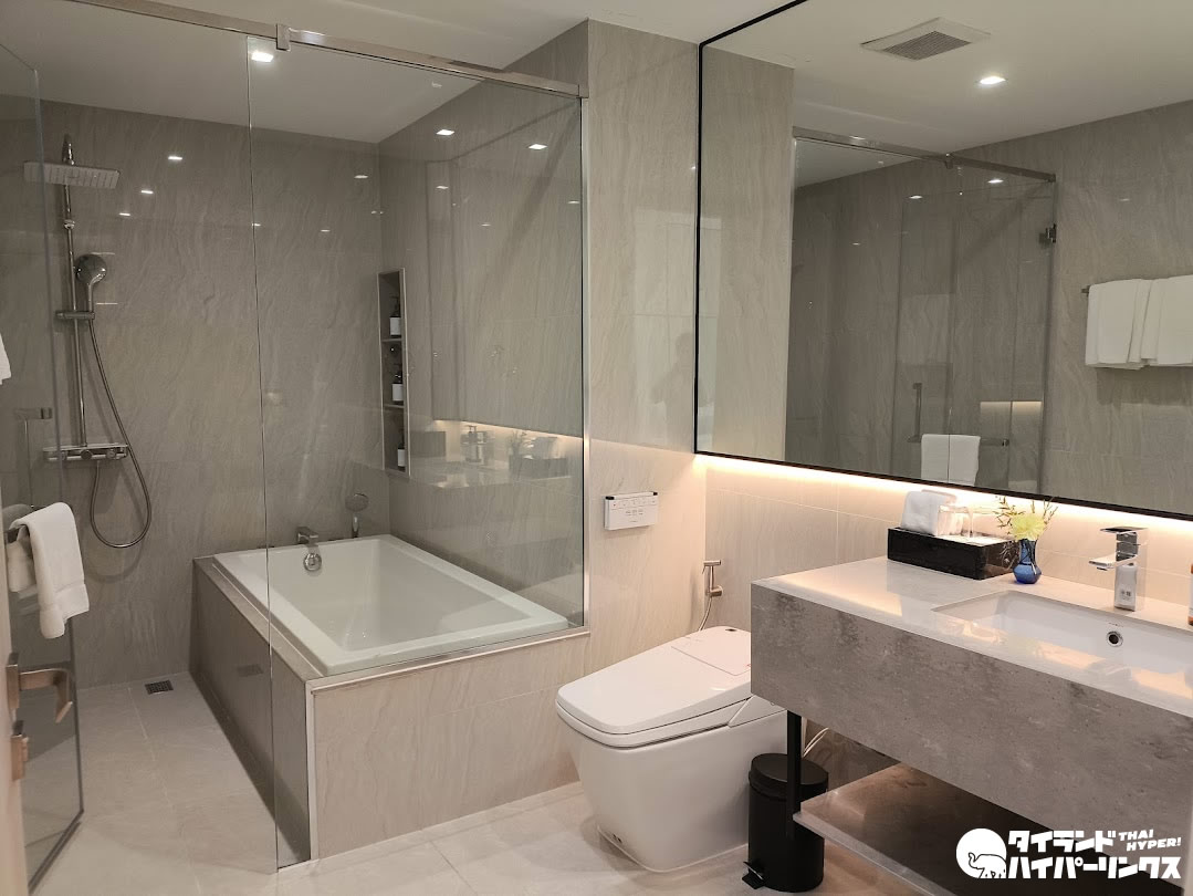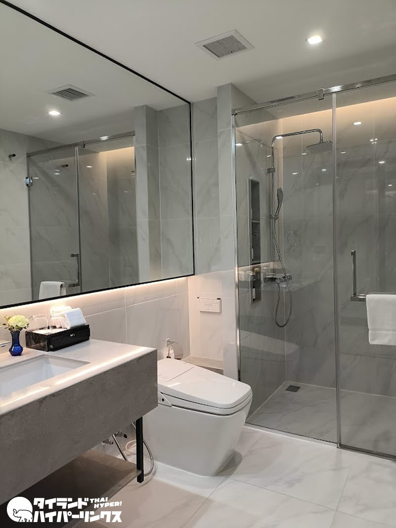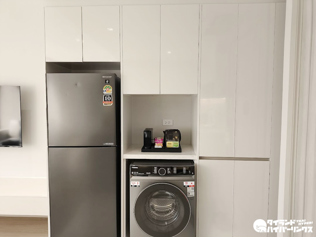 収納が多く、室内で洗濯から乾燥まで完結できる設備構成。ホテルとしての快適さに加えて、生活を前提に考えられているからこそ、「泊まれる」というより、正直「住みたい」と感じる客室です。特に乾燥機付き洗濯機の存在は大きく、長期滞在したくなってしまう理由がはっきりあります。