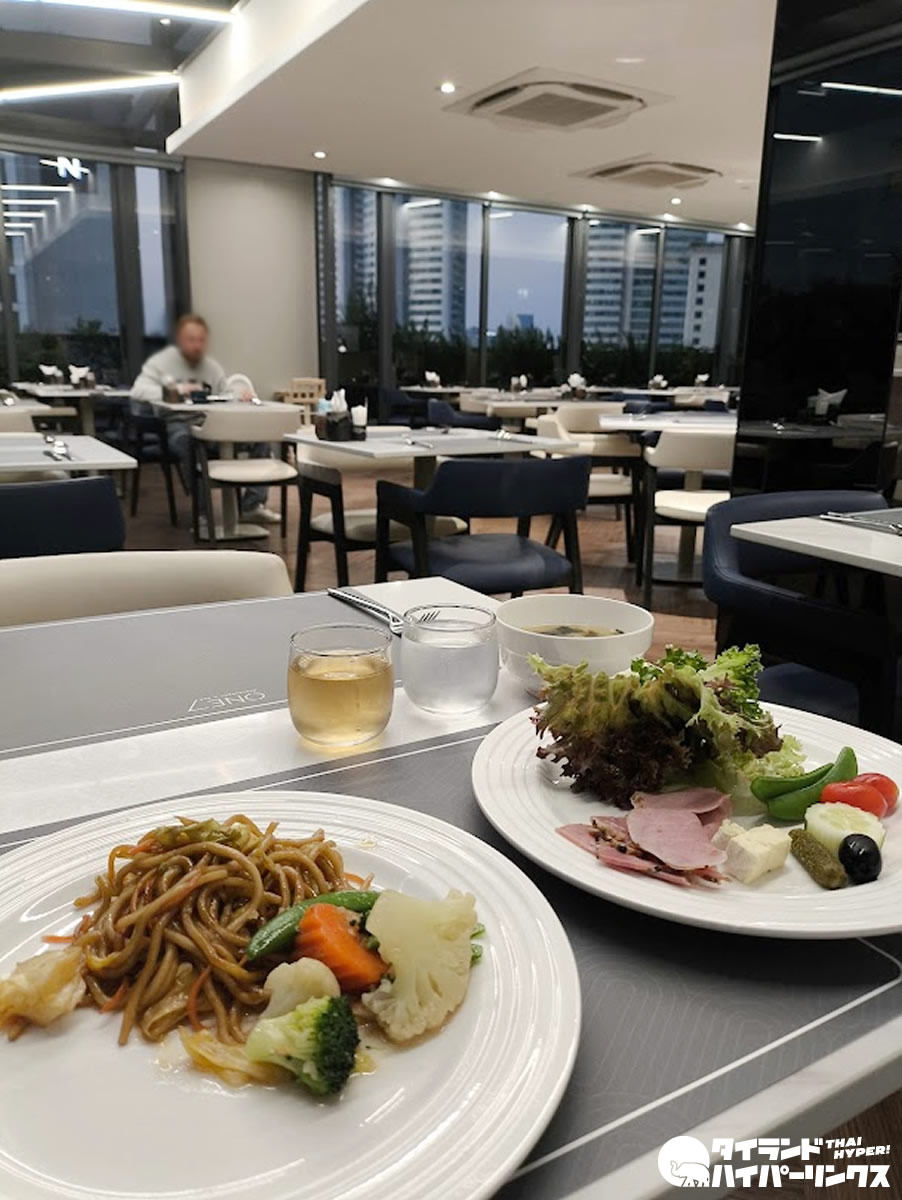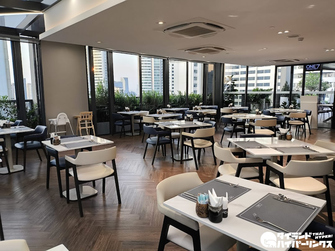 「ONE7 Restaurant and Bar」は17階のプール横に位置し、店内からはバンコクの街並みを眺めることができます。今回はディナーでの利用で、パッタイやトムヤムクン、サテといった定番のタイ料理を注文しました。気取った構成ではなく、ホテル内で安心して楽しめる内容です。