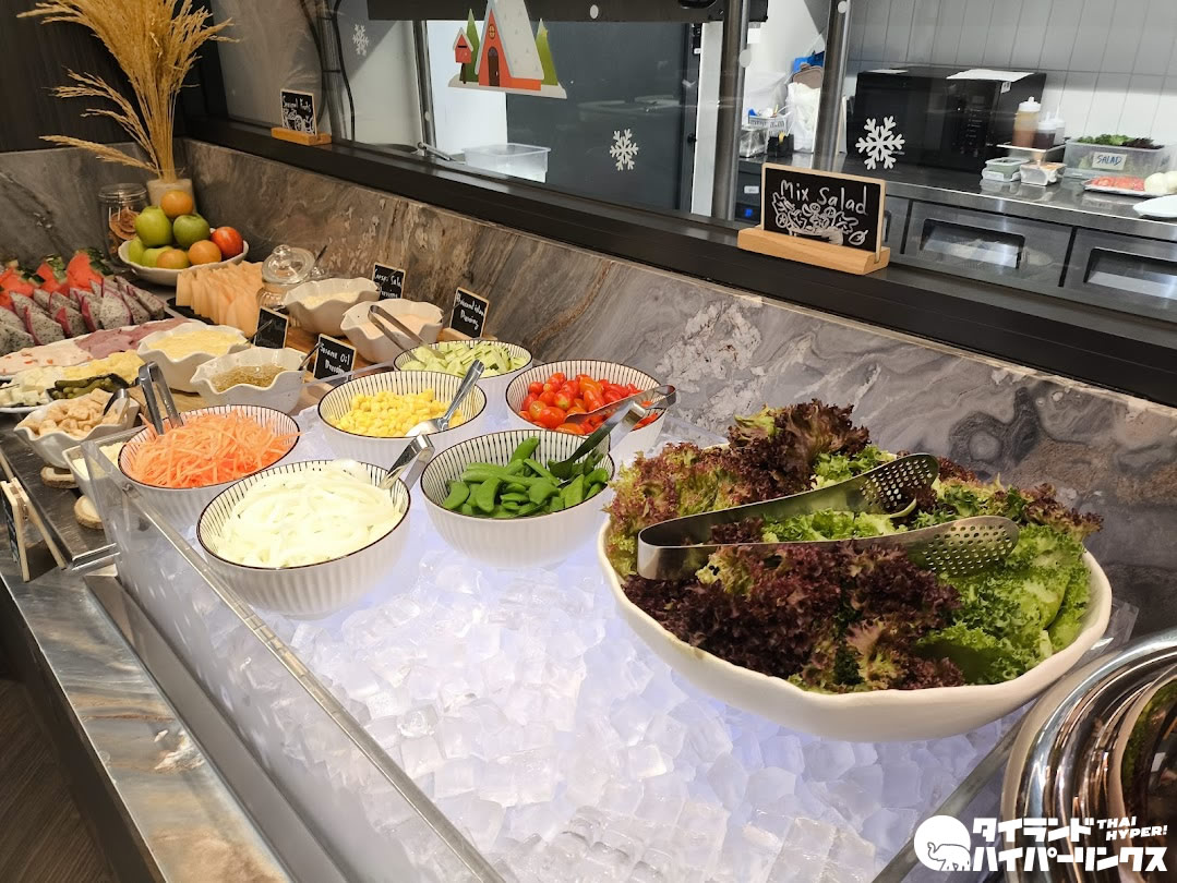 そのほか、フルーツ、ジュース、サラダ、パン類、ヨーグルトなども一通りそろっており、軽めにも、しっかりめにも調整しやすい構成です。