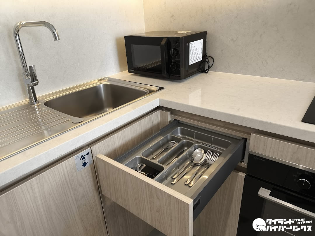 キッチンには食器類がそろっているほか、電子レンジ、トースター、オーブンを完備。簡単な調理ができる環境が整っており、外食が続いたときの逃げ場があるのは、滞在中に意外と助かります。