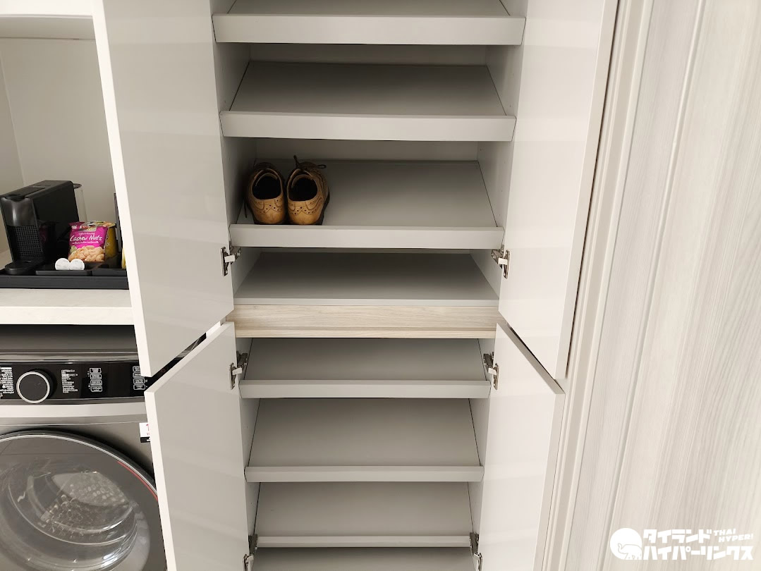 この部屋の大きな魅力は、収納の多さ。玄関には靴箱があり、靴をたくさん置けるのも喜ぶ方がいそうです。リビングにも棚が多く、ベッドルーム横のクローゼットエリアも広く、長期滞在でも荷物の置き場に困りません。部屋の各所にコンセントが多く配置されている点も、生活目線では重要です。