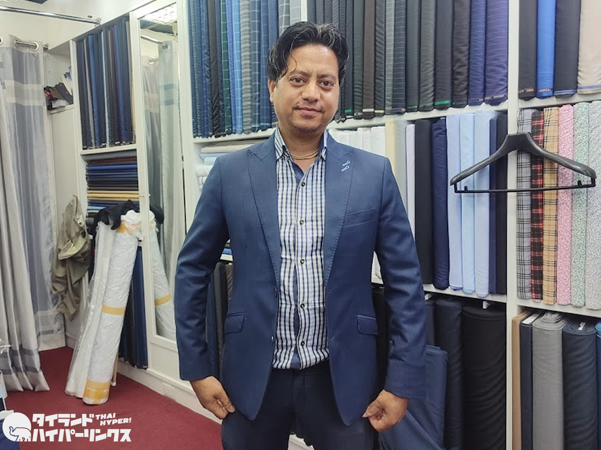 下の写真は「HongKong Fashion」の店主で、着用しているスーツのジャケットは、5年前に作ったという一着で、まだまだ着られます! タイ産ウール40%の生地で、上下のセットが1万2000バーツ(約4万8000円)の品です。