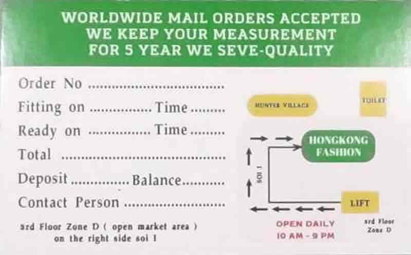 「Hong Kong Fashion」があるZone D Soi Iの場所。まずは名刺の連絡先と地図をご覧ください。
