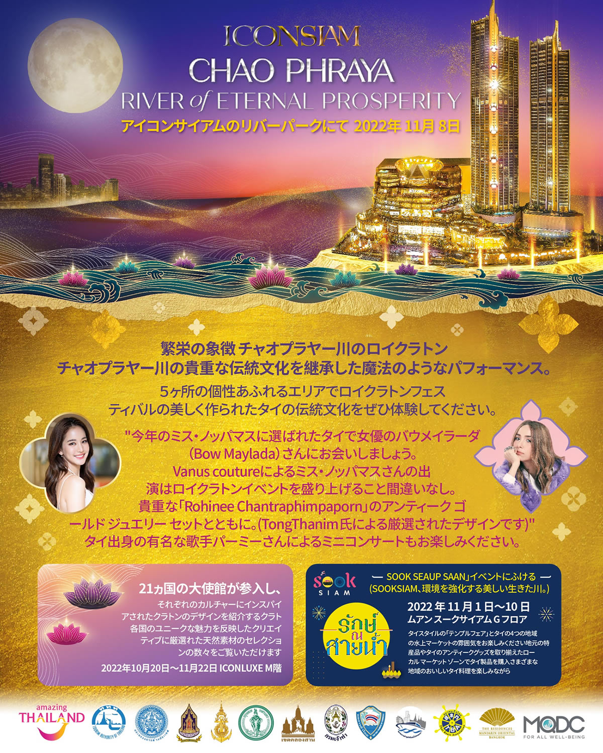 バンコク西岸のICONSIAMでは2022年11月8日(火)、ロイクラトンを祝う「ICONSIAM Chao Phraya River of Eternal Prosperity」を開催します。光り輝く満月の夜に、蝋燭を灯したクラトン(灯籠)で煌めく歴史あるチャオプラヤー川の魅惑的な美しさをご覧ください。
