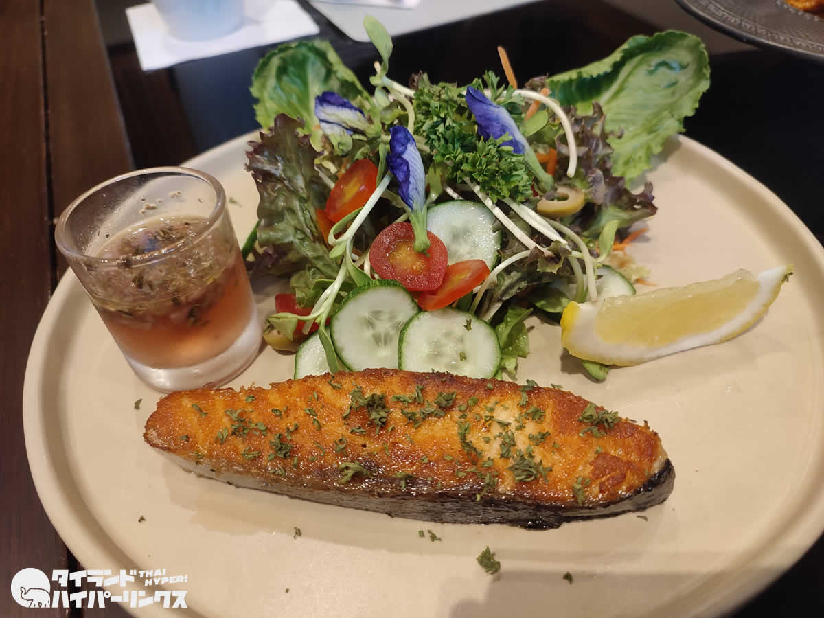 タイ人も大好きなサーモンは「グリルサーモンとグレートサラダ」(320バーツ)。