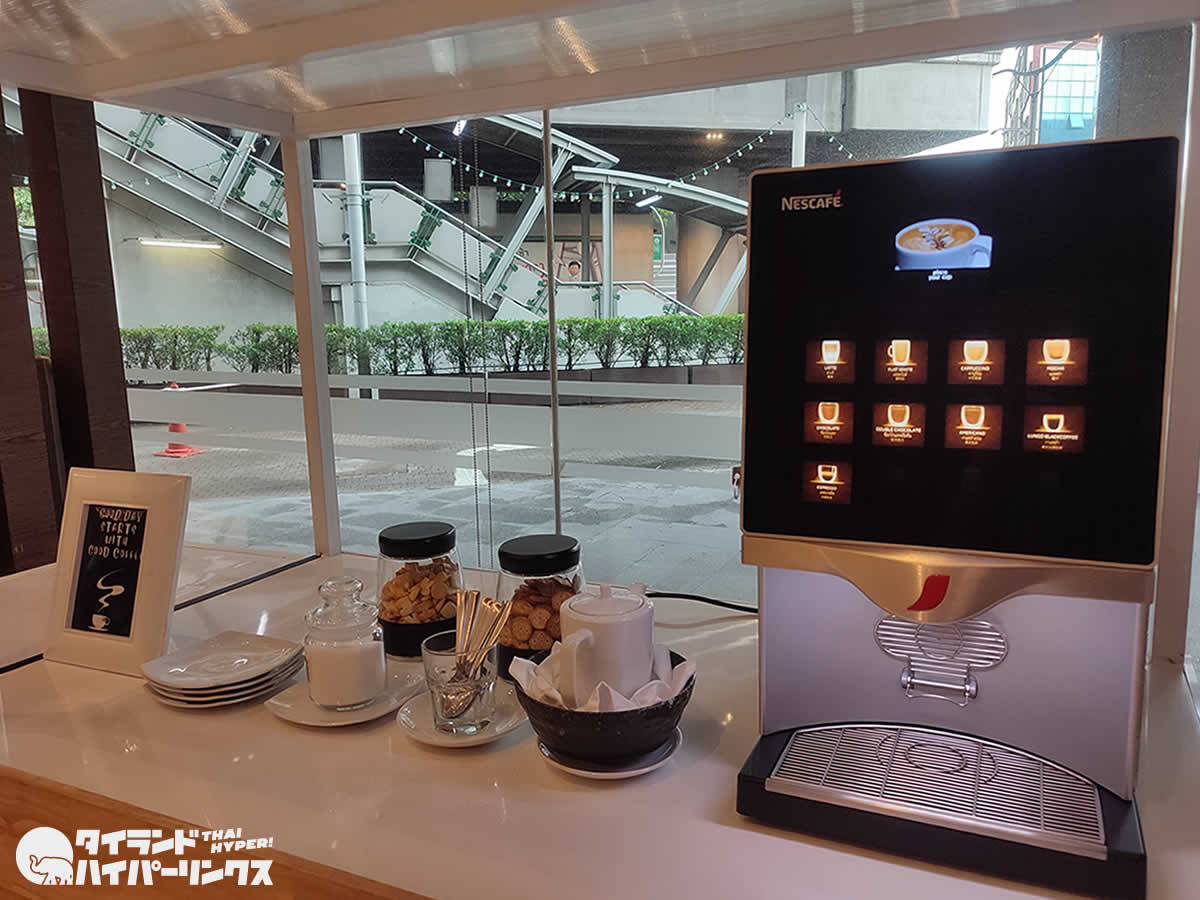 ここには宿泊者は無料で利用できるコーヒーメーカーがあり、コーヒーだけでなくココアなどもあり、スナックも用意されています。