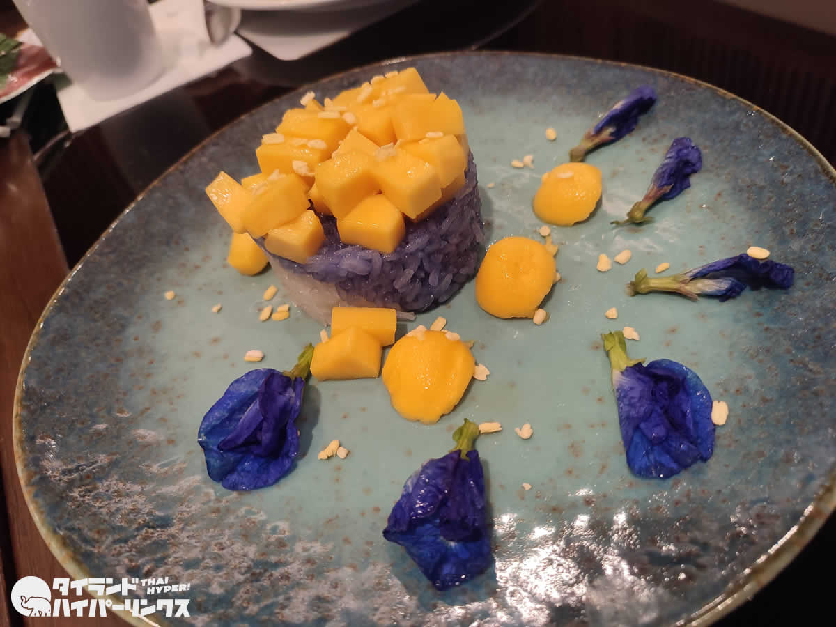 タイの食後のデザートといえば餅米マンゴー「カオニャオ・マムアン」(110バーツ)ですね!添えられている花はアンチャンと呼ばれるもので、餅米の着色にも使われています。
