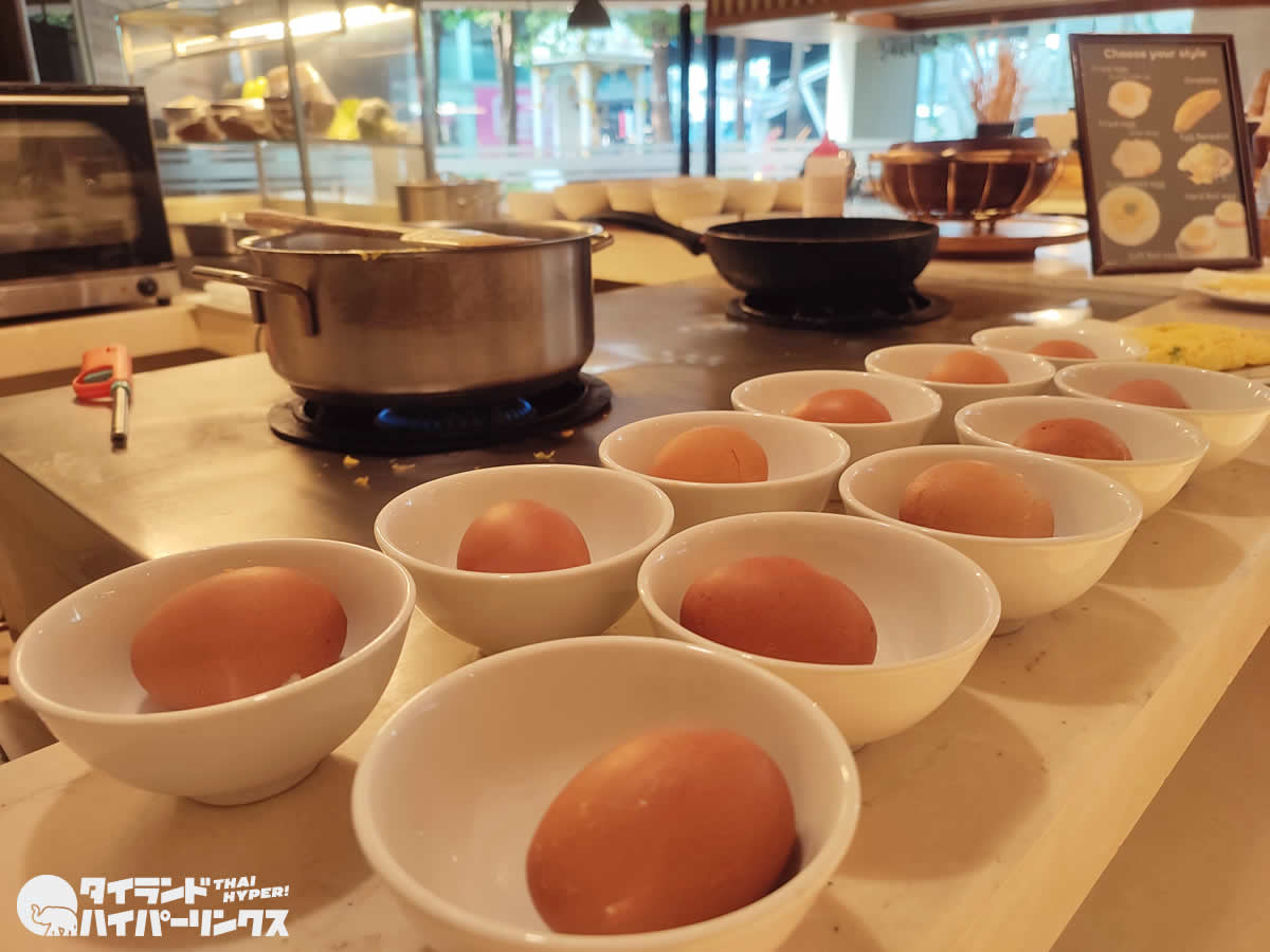 豪華な朝食も良いですが、毎日の朝食ならシンプルなのが一番ですね。本当なら生卵も食べたいところですが、タイでは生卵は一般的ではないので、ゆで卵や目玉焼き、オムレツなどを。